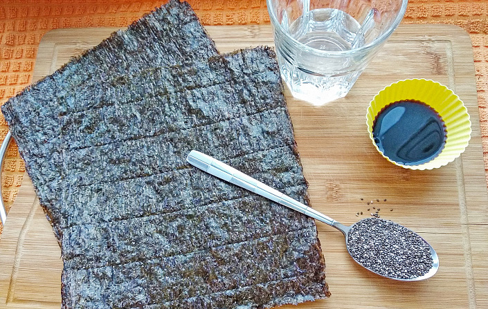 Листы нори смолоть в кофемолке до состояния муки. Смешать в одной таре семена чиа, муку из нори, воду и соевый соус. Добиться однородной консистенции. И поставить на ночь или на 8 часов в холодильник.