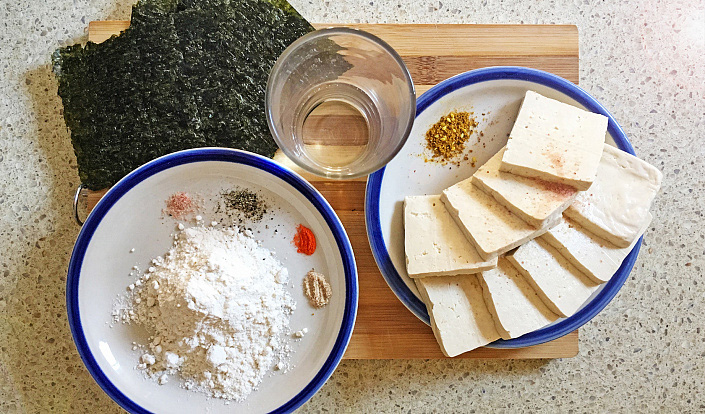 Разрезаем нори на 3 полоски для квадратных кусочков тофу или на 4 части для прямоугольников, сбрызгиваем лист нори водой и аккуратно заворачиваем сыр, края прижимаем.