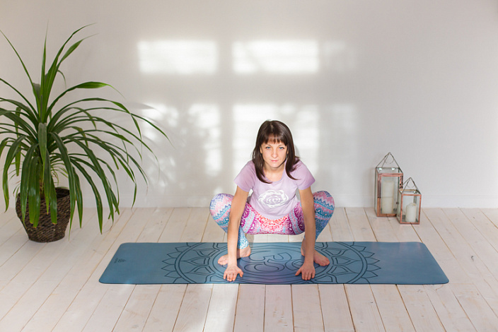 - В Позе ворона носки ног и колени уведите в стороны на 45 градусов от таза. Следите, чтобы носки не уходили внутрь, эта ошибка может неприятно отозваться на ваших голеностопных и коленных суставах.