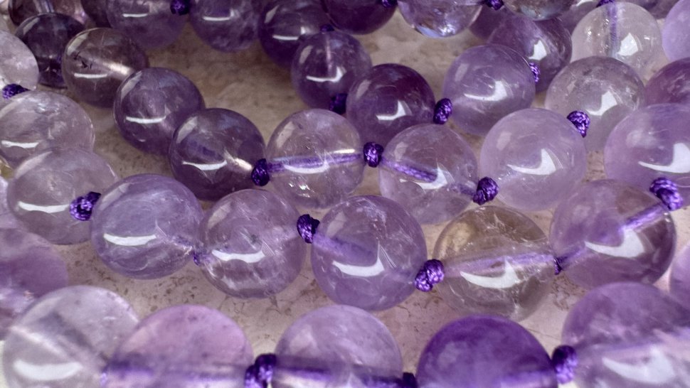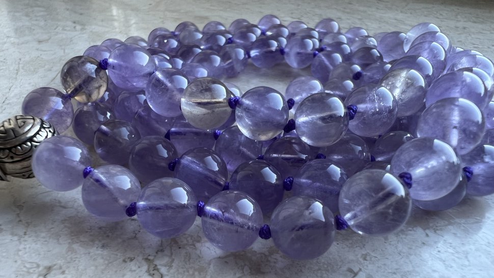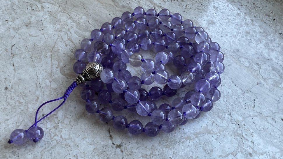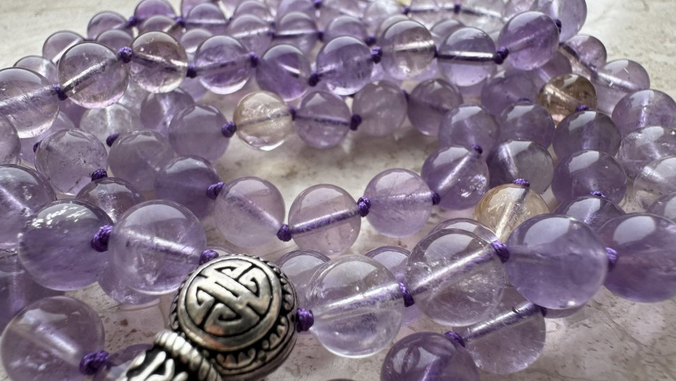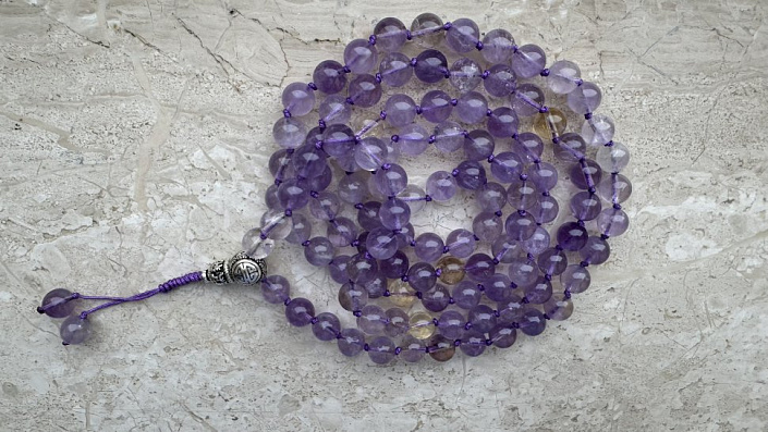 Эти чётки сделаны из полудрагоценного камня - аметрина, который обладает не только красотой, но и целительной энергетикой. Состоящие из 108 бусин диаметром 8 мм, они обладают невероятной энергией, заряжая вас позитивом и умиротворением.