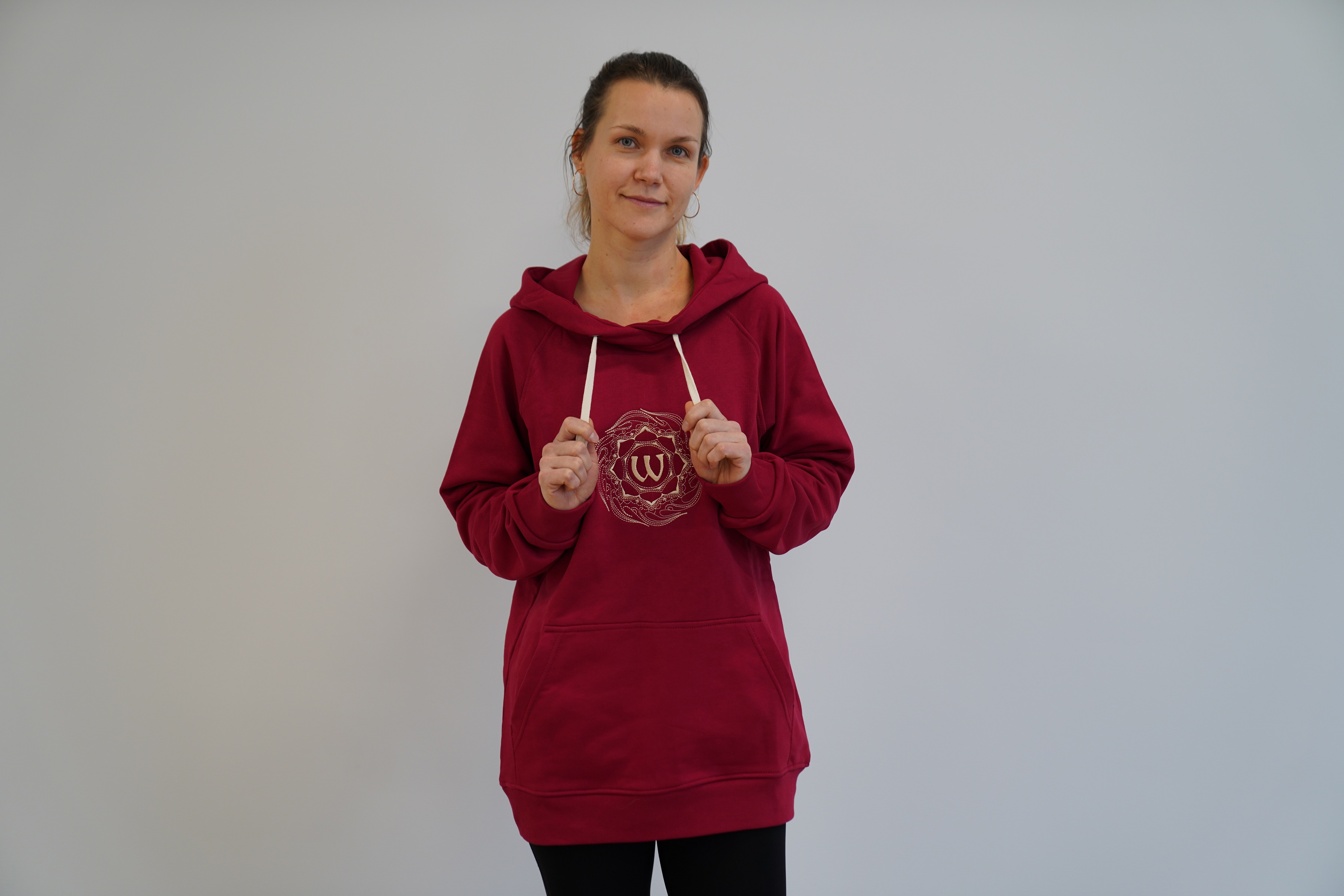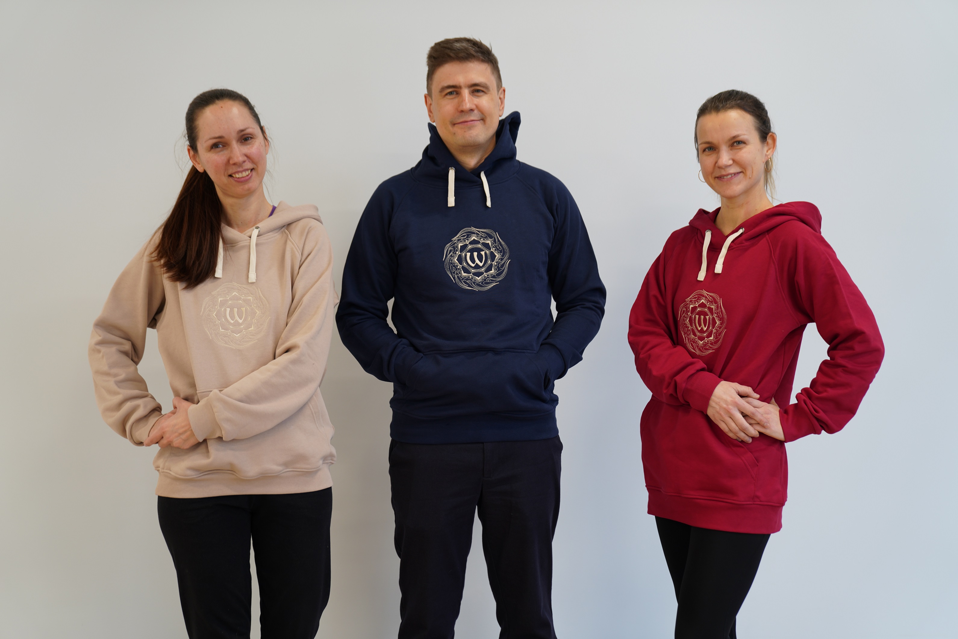 Лицевая сторона: логотип клуба Oum.ru (вышивка) — знак «ОМ» (буква «Омъ» в славянском алфавите) в лотосе, которые находятся в огненном солнечном круге.