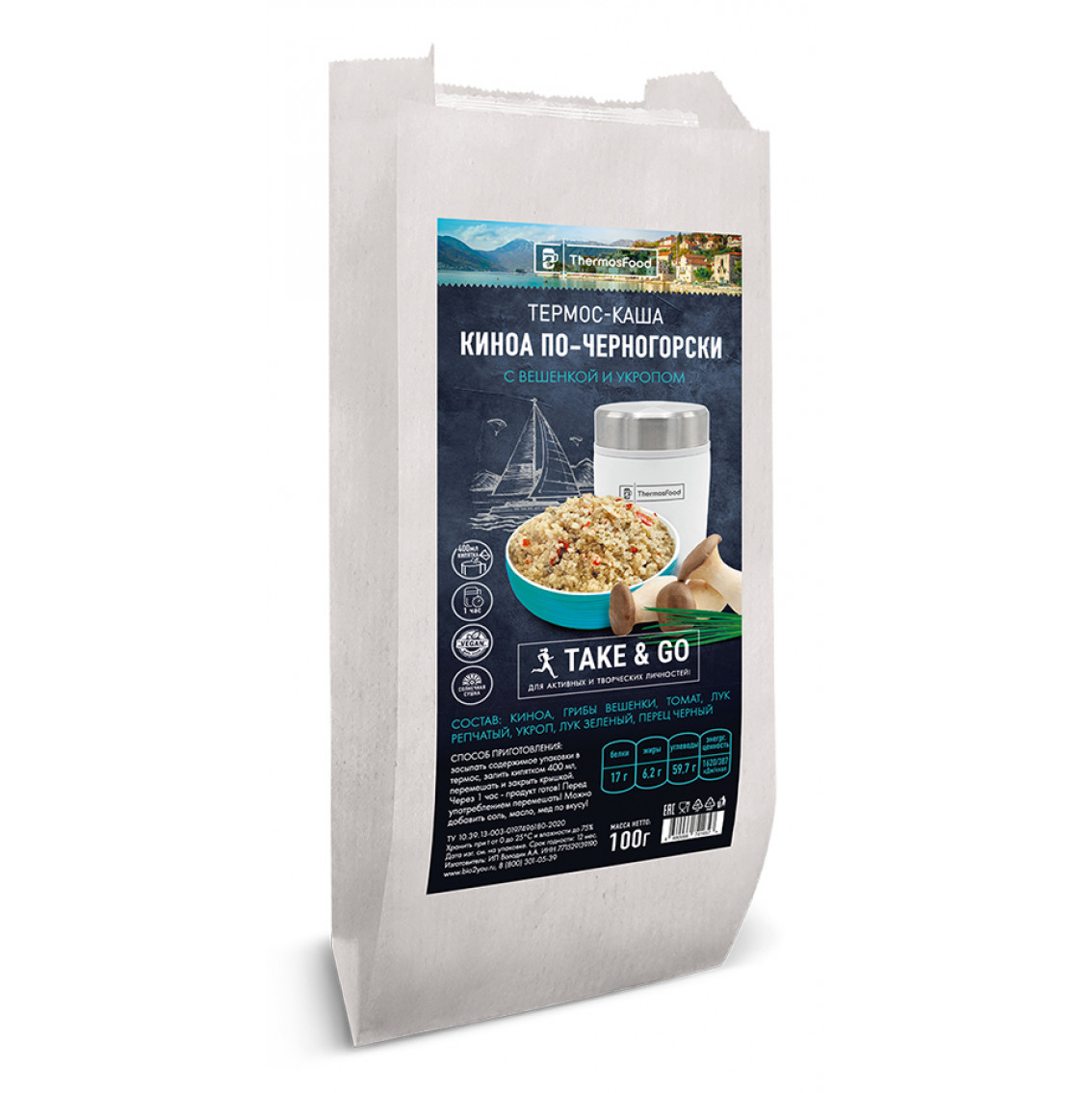 Состав: Киноа, грибы вешенки, томат, лук репчатый, укроп, лук зеленый, перец черный.
