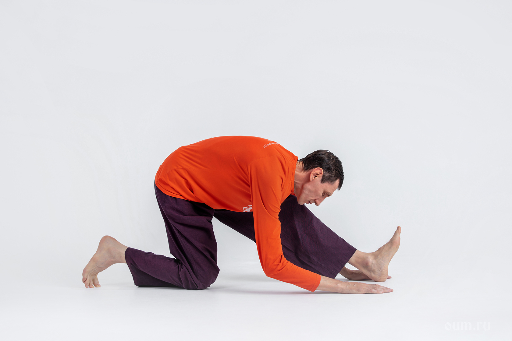 - Правая нога прямая и сильная, не подаётся вперёд. Живот длинный и тянется в направлении к правой ноге, таз не раскрываем. Наклон выполняем, пока спина и правая нога может оставаться прямой.