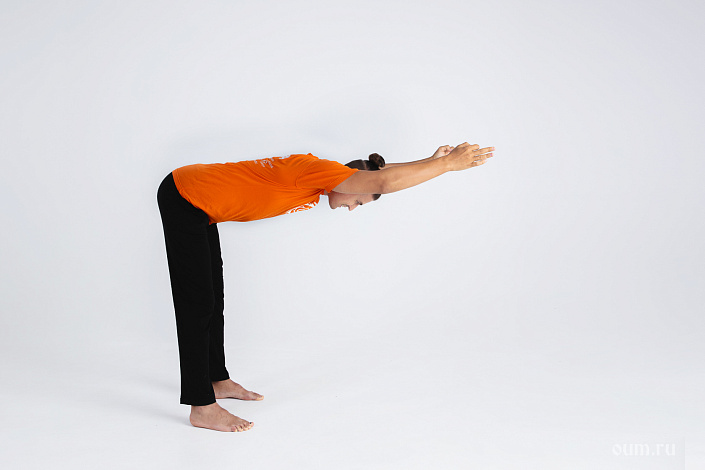 - с выдохом наклонитесь вперёд, складываясь в тазобедренных суставах;