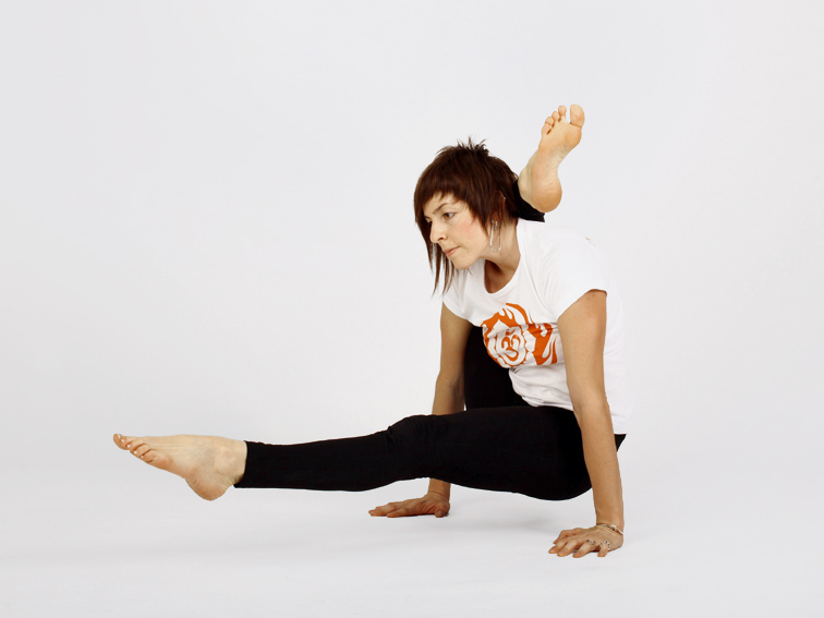 - ладонями упритесь в пол возле таза и выпрямите руки, при этом постарайтесь прямую правую ногу приблизить как можно ближе к голове