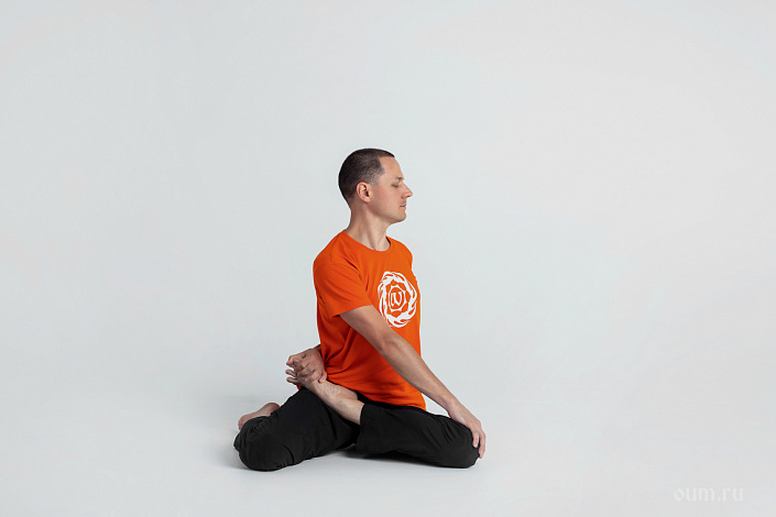 - на выдохе повернитесь вправо, левую ладонь уложите поверх правого колена;