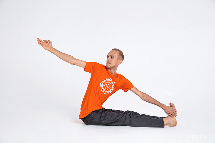 Это вариация Дандасаны — классической Позы посоха (палки) с разворотом корпуса и захватом за внешний край стопы.