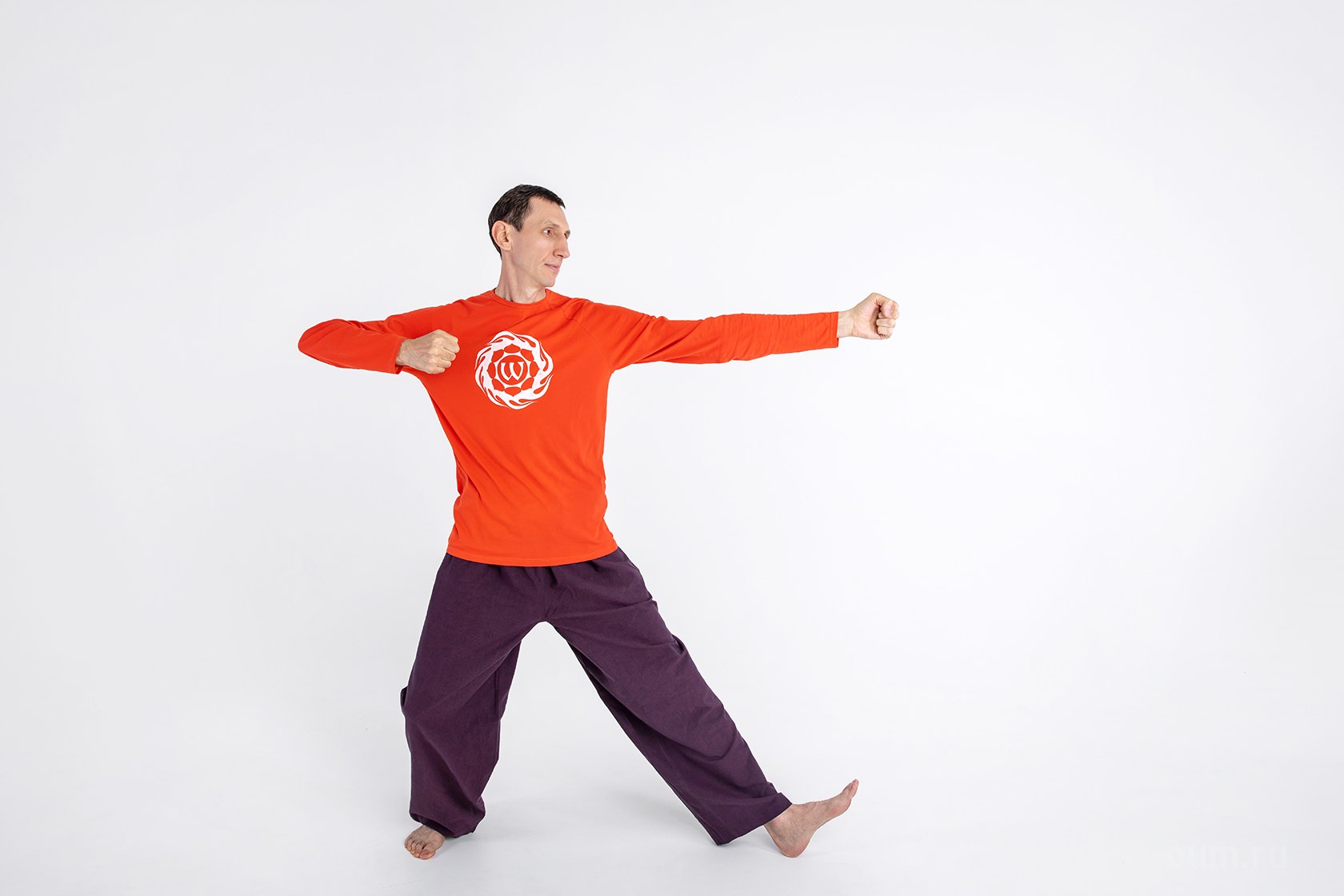 - представьте, что руками вы натягиваете тетиву лука на уровне горла; правая рука согнута в локте и отведена назад за правое ухо, правый локоть — на уровне правого плеча, пальцы сомкнуты в кулак, большой палец поднят вверх; левая рука выпрямлена вперёд от корпуса на уровне плеча, пальцы сомкнуты в кулак, большой палец поднят вверх; представьте, что тетива вашего лука тугая и вам необходимо с усилием разводить руки друг от друга;