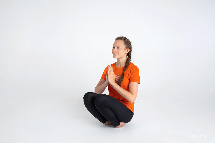 - приподнимите колени от пола; удерживая баланс, сложите ладони у груди.
