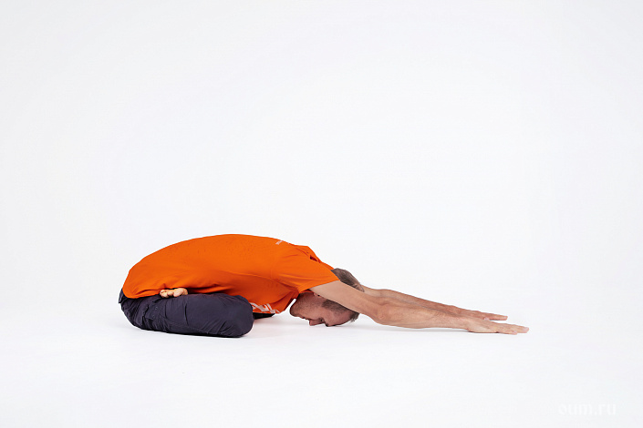- с выдохом выполните наклон вперёд и опустите лоб на коврик; вытянутые руки опустите на коврик над головой; задержитесь в этом положении;