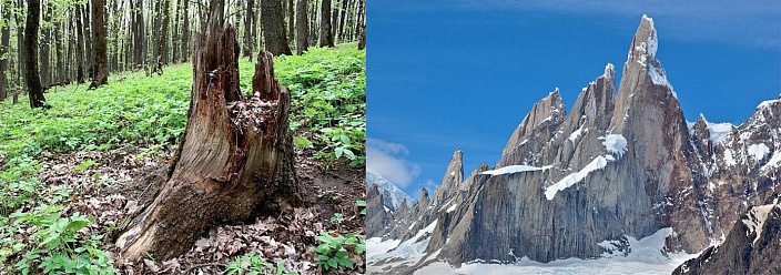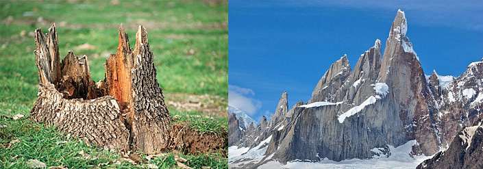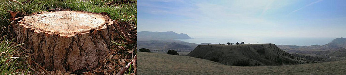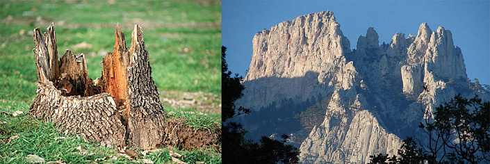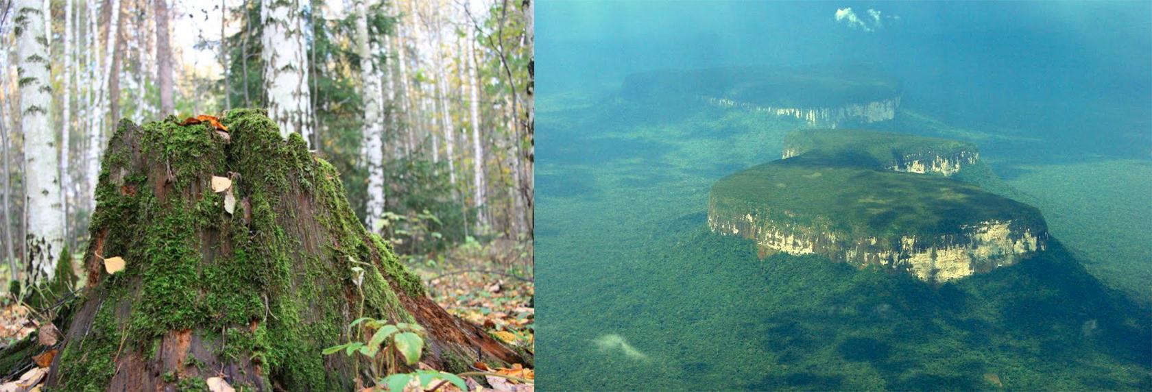 А теперь, давайте вспомним, с чего начинался наш разговор. Мы полагали, что видели леса и гуляли в них. Ну и что, что их рост 30 метров? Разве бывает по-другому? Мы к таким лесам привыкли, нам других и не надо. Затем выяснилось, что в США сохранился старый лес, который изображают в сказках - гигантские стометровые секвойи. Именно таких исполинов рисует фантазия, когда мы слышим фразу Сказочный Лес. На секвойях Калифорнии наше воображение ставит точку (призма заставляет). В противном случае предохранители разума просто перегорят, так как размер Башни Дьявола указывает на древо шести километровой высоты. Но далее и вовсе выяснилось, что Башня Дьявола — это только молодой побег по сравнению с другими экземплярами, найденными на планете. Например, гора в Кейптауне (Африка) имеет диаметр плато 3 км. Следовательно, умножив на 20, получим африканское древо высотой 60 км. Это в десять раз выше Башни Дьявола. Конечно наш разум отказывается видеть в кейптаунской горе пень. Попробуйте хотя бы представить какого размера были ветви такого древа? Только на одной такой ветке смог бы спокойно поместится целый спальный район с торговыми центрами, школами и парками. В голове не укладывается, верно? Представить подобное сложно, потому что призма-телохранитель нашего разума очень сильно искажает окружающий мир. И мы об этом уже говорили ранее. Попросите любого человека показать на правом фото деревья, и он немедленно укажет на зелень. Не заметив, что эти жалкие кусты (в которых он видит деревья), даже кустами не назовёшь. В таком сопоставлении зелень скорее выглядит как мох, нежели как лес.