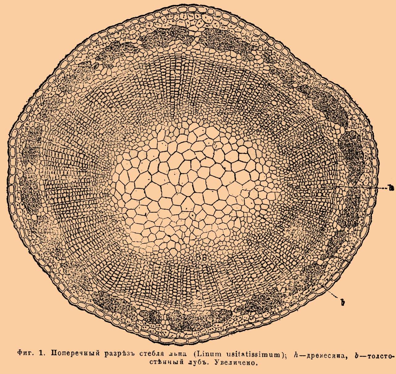 Дальше — больше. Теперь открываем учебник ботаники, находим строение какого-нибудь растения и сопоставляем с нашим гигантским пнём. Позвольте представить вам поперечный срез стебля льна.