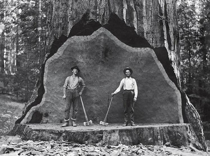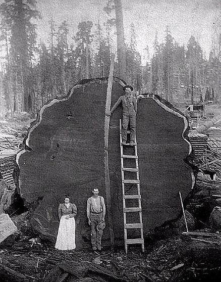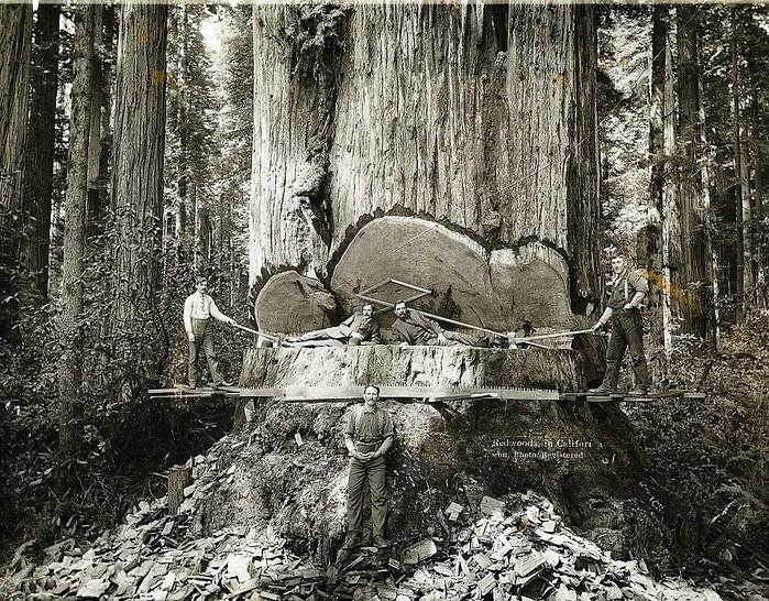 Это кадры вырубки секвой Калифорнии с 1880-х по 1920-е годы. Вы только представьте, сколько нужно лет, чтобы вырасти дереву до таких размеров. А потом пришли люди с пилами и топорами и…