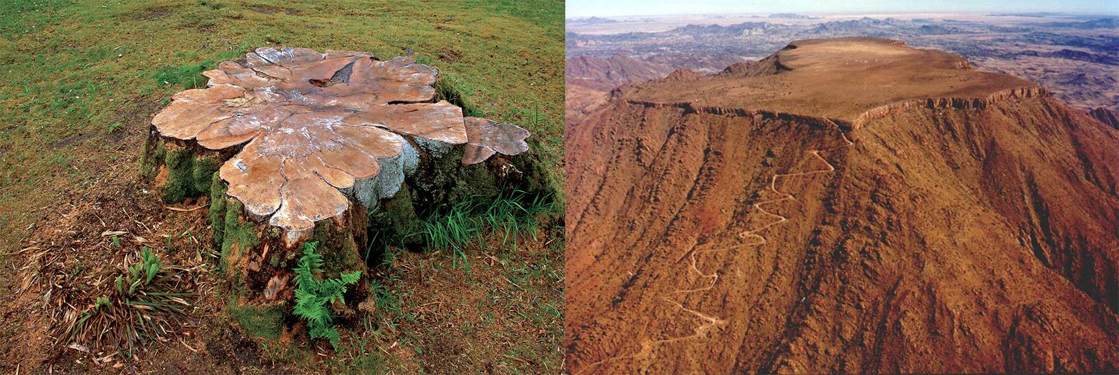 Если присмотреться внимательно к этой фотографии, то можно заметить, что вершина этой горы плоская. О чём нам это говорит? Всё просто. Дерево было спилено. Понятно, что данное утверждение сразу же рождает ряд вопросов. Кто спилил? Для чего? Чем пилили? На эти вопросы мы ответим позже, потому что пока они уходят на второй план. Сейчас же нас интересует другое - этот спиленный пень не единственный на планете. Вот и другие. Учёные окрестили такие горы Столовыми, потому что их вершины ровные как стол.