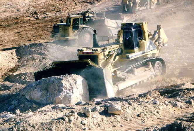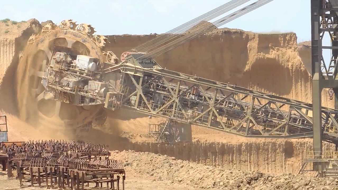 А вот так роторный экскаватор работает: он ползёт на гусеницах параллельно карьерной стене. Огромный диск с ковшами выскребает породу, оставляя вогнутую стену из камня.