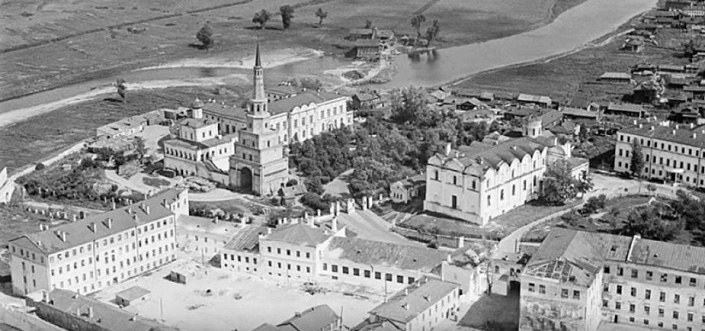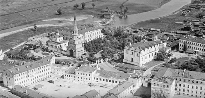 Попробуем в качестве примера изучить здание Казанского Кремля. Мало того, что здание засыпано по окна первого этажа – это отдельный разговор, но на данный момент нас больше интересует здания в правом нижнем углу – на его крыше полностью отсутствуют печные трубы.