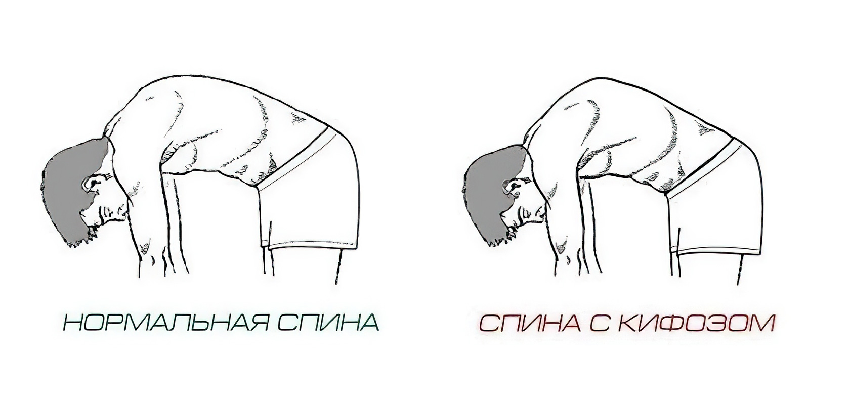 - «Круглая спина» отличается наличием гиперкифоза грудного отдела позвоночника наряду с нормальным лордозом поясничного отдела.