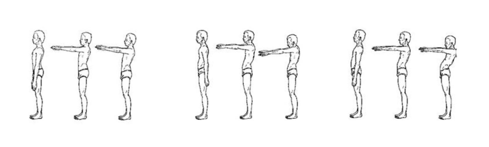 Тест выполняется в вертикальном положении. Нужно попросить испытуемого поднять руки перед с собой на уровне плеч и удерживать такое положение в течение более 30 с. Исследователь наблюдает за тем, что происходит с осанкой исследуемого по истечении этого времени. Если во время удержания рук в таком положении осанка исследуемого не изменилась в значительной степени (допустим незначительный наклон туловища назад), значит, у него нормальная осанка с хорошей мышечной функцией (рис. 1-й, слева направо). Если исследуемый удерживает нормальную осанку в течение 30 с., но затем у него увеличиваются грудной кифоз и поясничный лордоз, это говорит скорее о функциональном нарушении осанки, о её слабости (2-й рис.). Если же исследуемый с самого начала не может принять вертикальное положение и резко наклоняется назад, уводя таз вперёд, можно говорить о структурном изменении осанки (3-й рис.).
