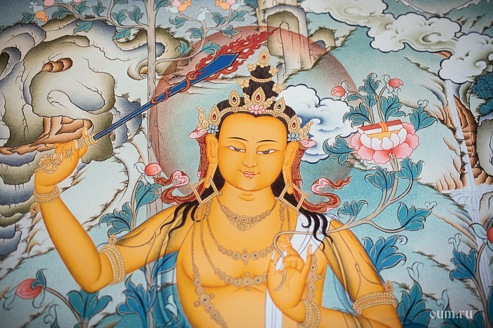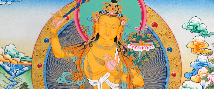 В переводе с санскрита «Манджушри» означает ‘великолепная слава’. Бодхисаттва Манджушри считается воплощением и символом парамиты мудрости. Манджушри является сподвижником самого Будды Шакьямуни. Манджушри постоянно пребывает в самадхи «пустоты, отсутствия обликов и желаний». Он представляет собой воплощение высшей мудрости, разума, воли, всеведения и полного просветления.