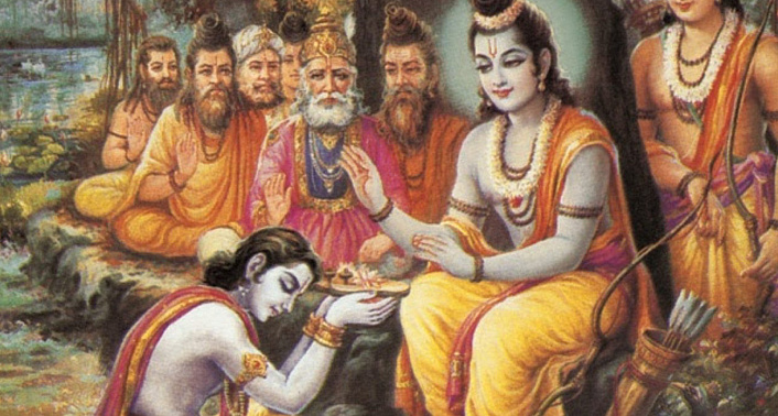 Тогда царевичу Бхарате пришла такая мысль: «Мой брат царевич Лакшмана и моя сестра царевна Сита не могут перенести боль от смерти отца, Рама же не причитает и не печалится. Что же может быть причиной отсутствия его печали? Мне нужно его спросить». И, намереваясь спросить его, он произнёс такую гатху: