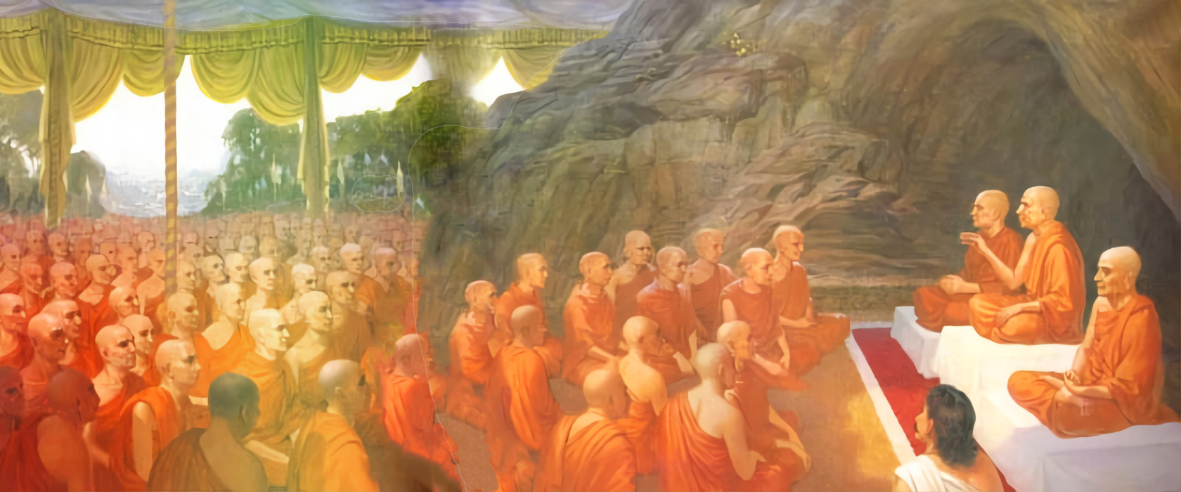 Ему были переданы оставшиеся пятьсот одеяний как по праву за все великие заслуги. Впоследствии молодой монах раздал их своим наставникам. Все они разрезали их, покрасили в жёлтый цвет, как цветок карникара, и одетые в них пришли к Учителю, поприветствовали его и сели по одну сторону.