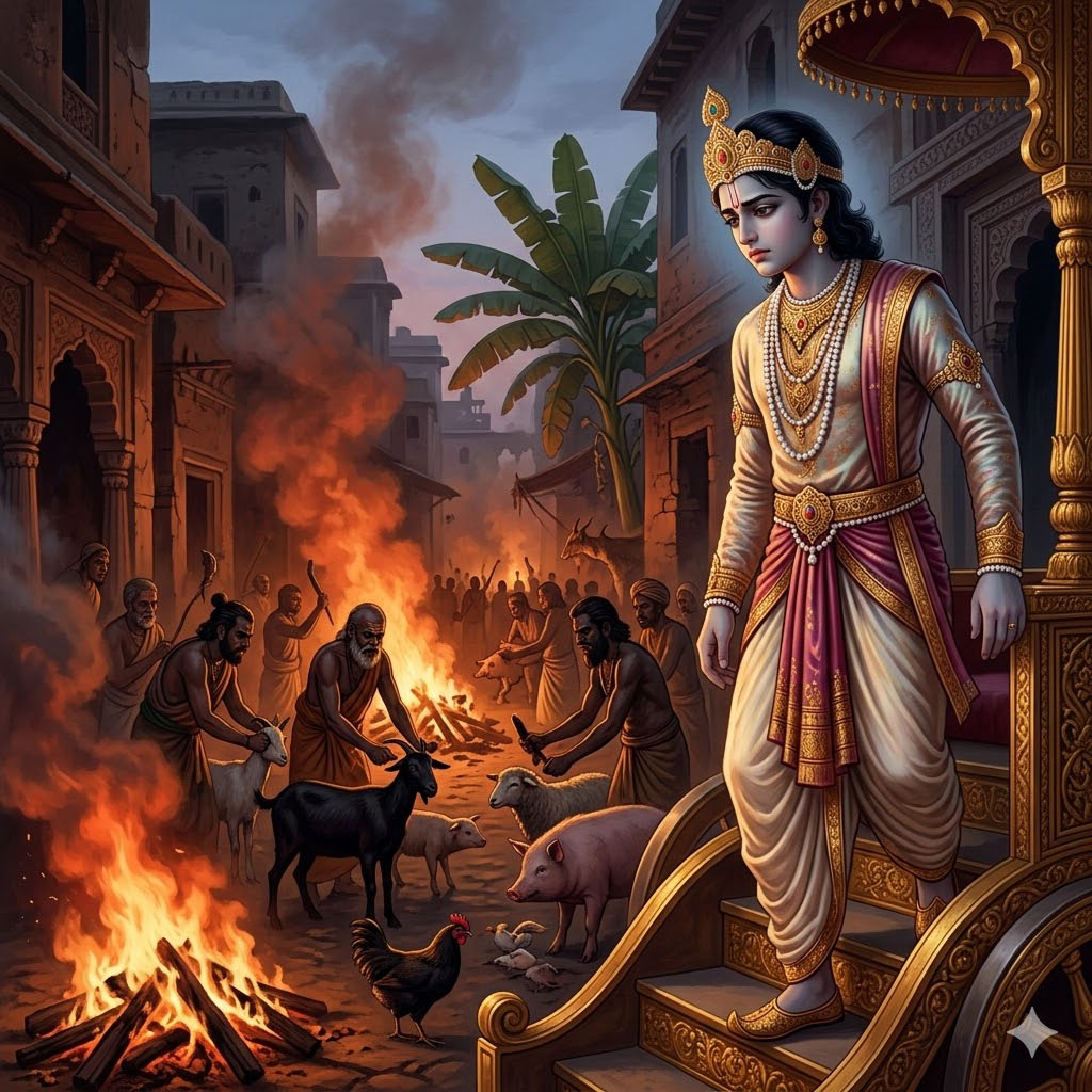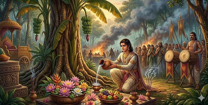 В то время жители Варанаси чествовали и поклонялись божествам; они совершали жертвоприношения не только различными цветами и благовониями, но также плотью и кровью различных животных, ради этого они убивали множество коз, овец, петухов, свиней и других животных. Тогда Бодхисаттва подумал: «Сейчас, чтобы почтить божеств, совершается множество убийств животных; из-за этого многие люди только больше предаются неправедности (адхарме). Когда я, после смерти своего отца, стану правителем, я, не причиняя никому вреда, лишь с помощью силы уловок остановлю убийства живых существ». Размышляя так, Бодхисаттва сел на свою колесницу и выехал из города. В одном месте он увидел толпу людей, что собрались у большого бананового дерева и молились божеству, обитавшему в этом дереве, даровать им сыновей и дочерей, почести и богатство, каждый по своему желанию и усмотрению. Сойдя с колесницы, Бодхисаттва приблизился к дереву и, как подобает, сделал подношения цветами и благовониями, окропил дерево водой и трижды обошёл его справа4. Поклонившись так божеству, он сел на свою колесницу и вернулся обратно в город. С тех пор он время от времени отправлялся туда, поклонялся [божеству] и делал подношения так, как подобает поклоняться божествам.