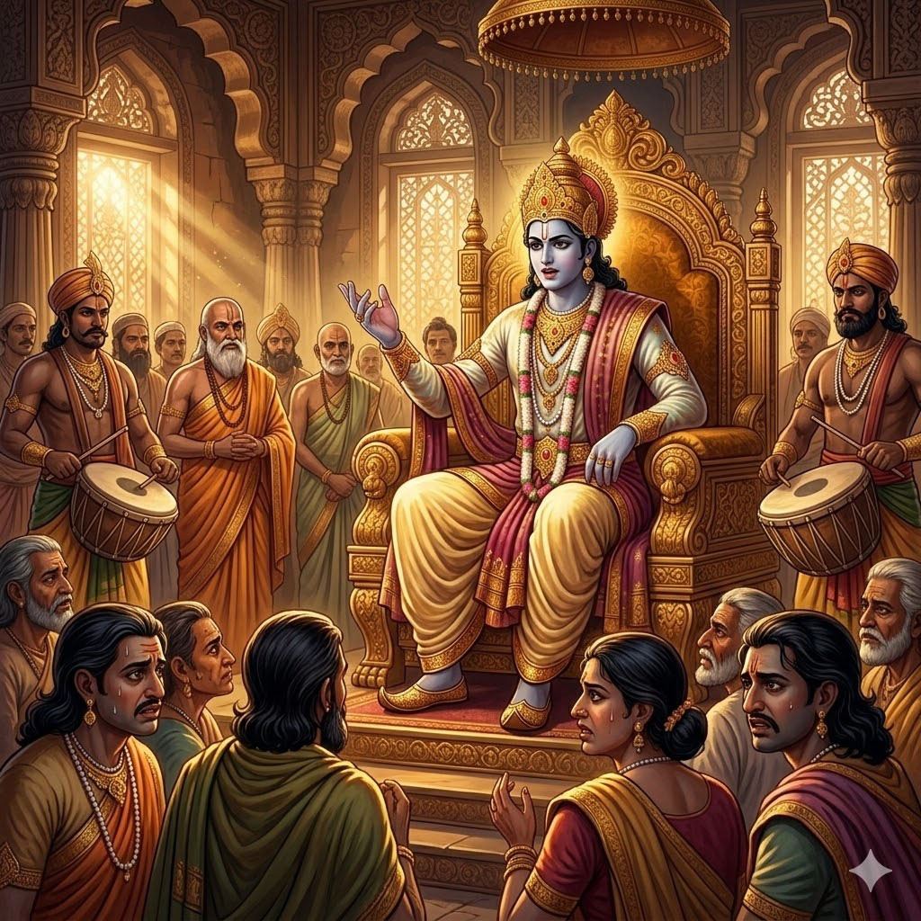 Со временем, когда Бодхисаттва после смерти отца взошёл на престол, он воздерживался от четырёх недостатков , практиковал десять царских добродетелей и правил своим народом в Дхарме.