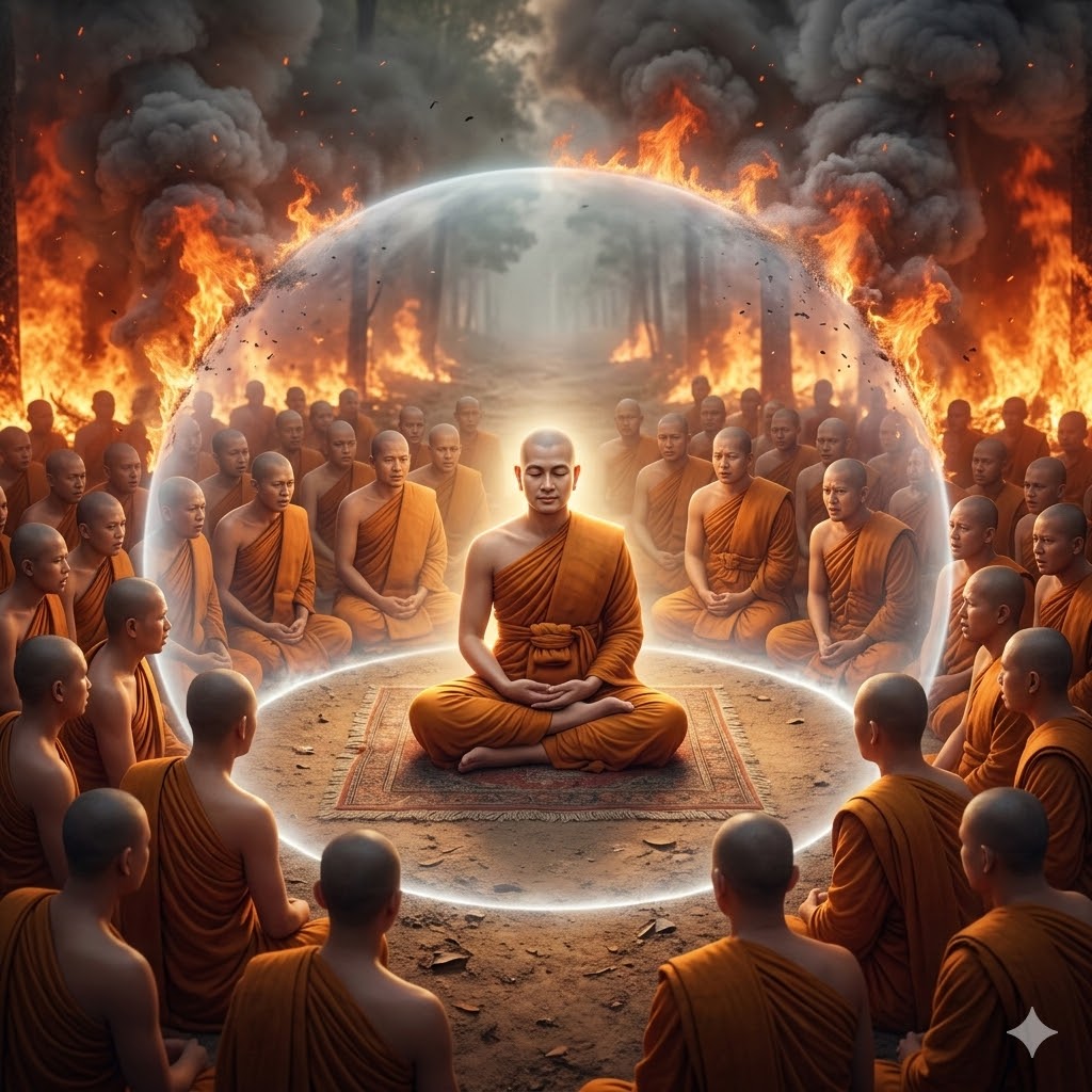 Тогда бхикшу стали восхвалять добродетели Учителя: «О, как велики достоинства будд! Ведь даже этот огонь, лишённый разума, не смог охватить место, где стоял Будда, и погас, как факел в воде. Узрите силу будд». Услышав их речь, Учитель сказал: «Монахи, это не моя нынче сила, благодаря которой огонь, подойдя к этому клочку земли, погас; это сила утверждения правды (сатья крия) из прошлого воплощения. Ибо в этом месте огонь не будет гореть в течение [всей этой] кальпы, потому что это «чудо, [которое длится на протяжении целой] кальпы». Тогда почтенный Ананда сложил материю четыре раза и расстелил её, чтобы Учитель мог сесть [на неё], и Учитель присел, скрестив ноги. Сангха (община) бхикшу почтила Татхагату и уселась вокруг него. Поскольку бхикшу просили Учителя [словами]: «Нам известно только настоящее, Почтенный, [ибо] прошлое скрыто от нас. Открой нам его!», он поведал о былом.