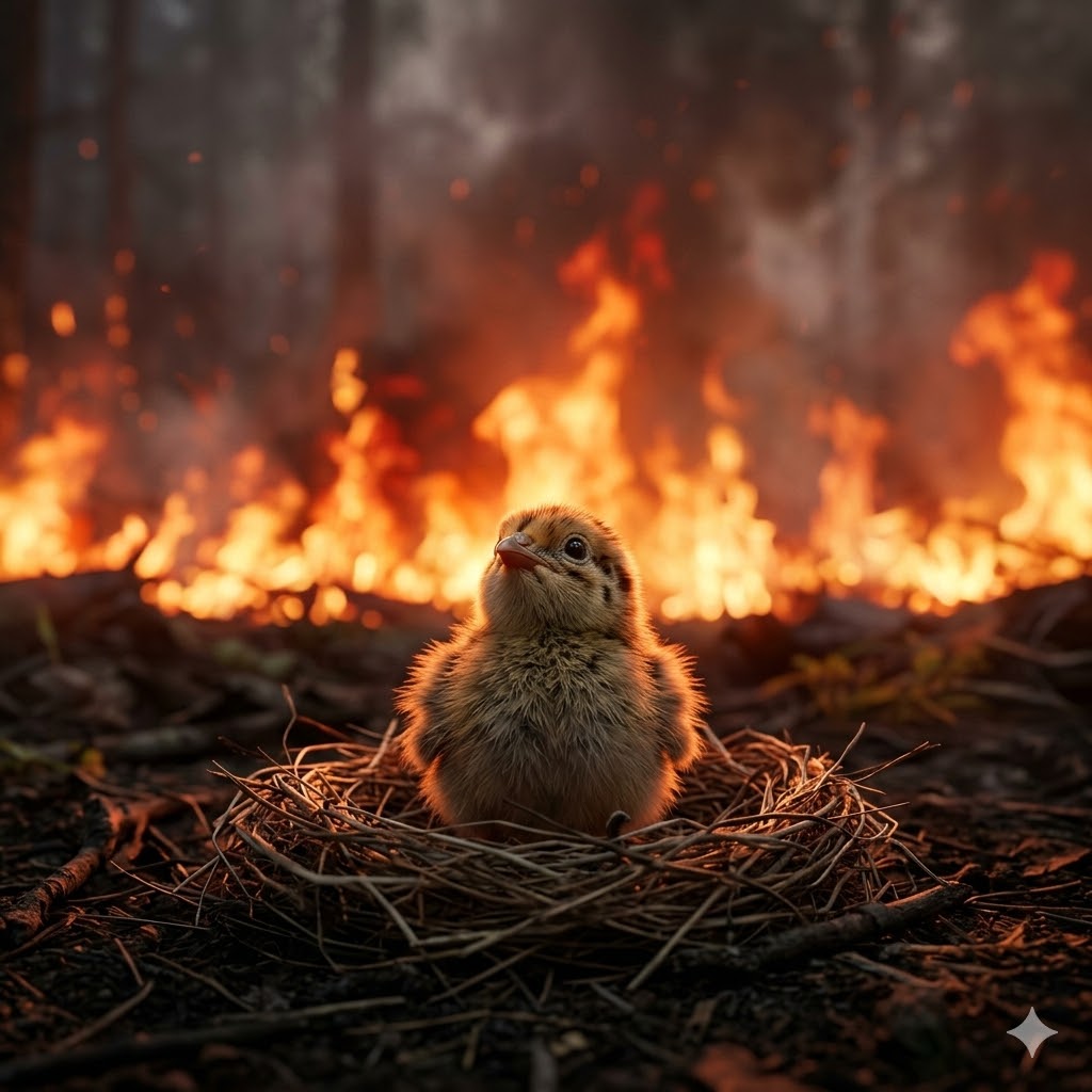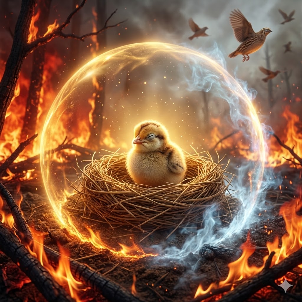 Однажды Бодхисаттва переродился в царстве Магадха, в этом месте2, в теле перепела. После зачатия в утробе матери он разбил скорлупу яйца и, когда вылупился, был молодым перепелом размером с большой шар. Родители вырастили его в гнезде и кормили пищей, которую приносили в клювах. Но он не имел сил ни расправить крылья и летать по воздуху, ни поднять ноги и ходить по земле. Из года в год это место всегда опустошалось лесным пожаром, и как раз в это время пламя обрушилось на него мощным потоком. Стаи птиц, вылетевшие из своих гнёзд, были охвачены страхом смерти и с криком улетели прочь. Родители Бодхисаттвы испугались не меньше остальных и улетели, оставив Бодхисаттву. Тогда Бодхисаттва, лёжа в гнезде, поднял шею и, видя, что огонь распространяется и приближается всё ближе и ближе, подумал: «Если бы у меня была сила расправить крылья и взлететь в воздух, я мог бы взлететь и отправиться в другое место; если бы у меня была сила поднять ноги и идти, я мог бы отправиться в другое место пешком. Мои родители, охваченные страхом смерти, тоже оставили меня одного и улетели, чтобы спастись. Теперь у меня нет другого убежища, я без защиты, без помощи. Что же мне делать [сегодня]?» Затем ему пришла в голову такая мысль: «В этом мире есть сила нравственности (шила); есть сила правды (сатья); есть такие, кто, прежде упражняясь в парамитах и сидя под деревом Бодхи3, стали пробуждёнными (самбуддами); обрели Освобождение (вимукти) благодаря нравственности (шиле); сосредоточению (самадхи) и мудрости (праджне); обладает видением в познании Освобождения (вимукти даршана джняны); исполнен правдивости (сатьи); сострадания (каруны); милосердия (нуддаи) и терпения (кшанти); одинаково с добротой (майтри) смотрит на всех существ, [а именно] всеведущие будды. Есть сила Дхармы, которую они познали; однако я также обладаю одной истиной, ибо знаю единый принцип бытия. Поэтому я должен, памятуя о буддах прошлого и о добродетелях, которые они познали, охватить [сознанием] мною понятый принцип бытия, исполнить утверждение правды (сатья крию), заставить огонь отступить и таким образом спасти и себя, и остальных птиц».