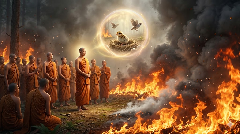 Затем Учитель завершил это поучение в Дхарме словами: «Бхикшу, то, что огонь не охватил этот лес, произошло не благодаря моей силе нынче, а благодаря моему предыдущему утверждению правды (сатья крие), в то время, когда я был молодым перепелом» — и провозгласил четыре арийские истины. В конце провозглашения четырёх благородных истин некоторые вошли в поток (сротапанну); некоторые стали однажды возвращающимися (сакридагаминами); некоторые — невозвращающимися (анагаминами); другие же — архатами. После этого Учитель так связал нынешние рождения с прежними: «В то время мои родители были моими нынешними родителями, а царём перепелов же был я сам».