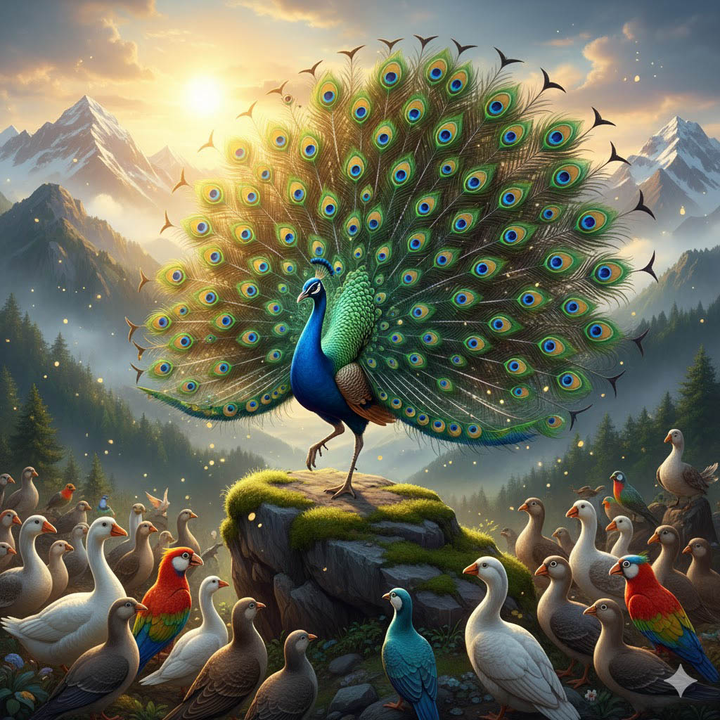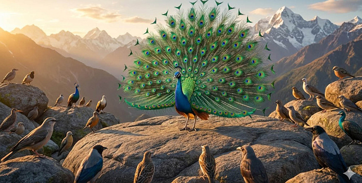 Та оглядела собравшихся птиц и, завидев пестрохвостого павлина с переливающейся, будто драгоценный камень, шеей, молвила: «Пусть он будет мне мужем!» Пернатые, приблизясь к павлину, сказали: «Дорогой! Царская дочь среди всех птиц выбрала тебя супругом!» Павлин, хмельной от радости, воскликнул: «Доныне вы ещё не узрели моего могущества!» И, забыв и стыд и совесть, пустился при всех в пляс, распушив крылья и обнажив срам. Молвив в смущении: «Нет в нём надлежащей скромности! Не отдам я ему своей дочери!» – златопёрый царь-селезень пропел такую гатху: