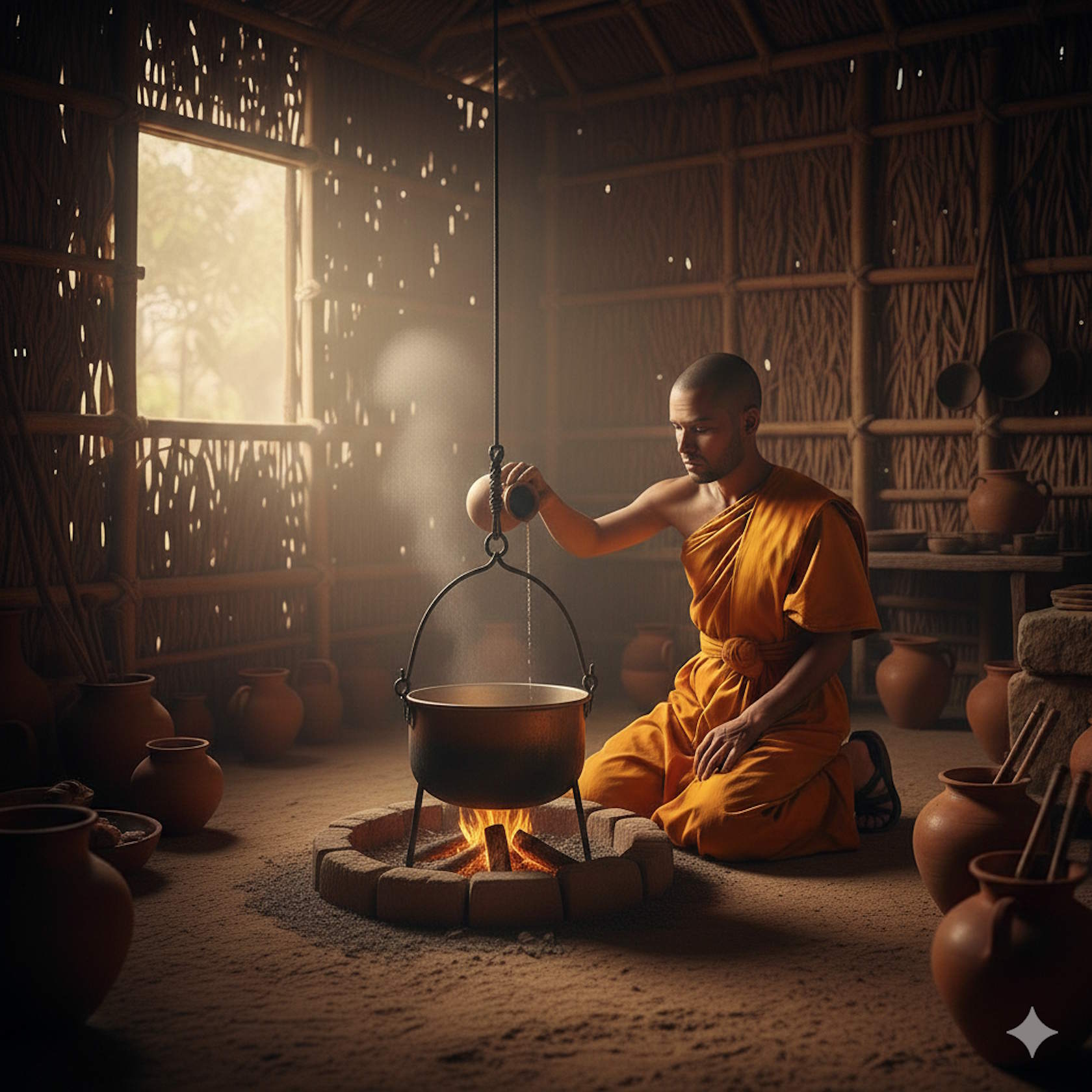 Как-то раз благонравный послушник поразмышлял над этой ситуацией и принял следующее решение: «Этот негодник приписывает себе всё, что делаю я. Нужно вывести его на чистую воду». И пока юный плут, вернувшись с обхода деревни, спал после трапезы, его совершенный в поведении товарищ нагрел воду для купания, спрятал её в задней комнате, а в котёл налил лишь небольшое количество воды, примерно в локоть3. Хитрец же, проснувшись и увидев поднимающийся над котлом пар, подумал: «Очевидно, мой брат-монах уже нагрел воду и отнёс её в купальню». Подойдя к Махакашьяпе, он сказал: