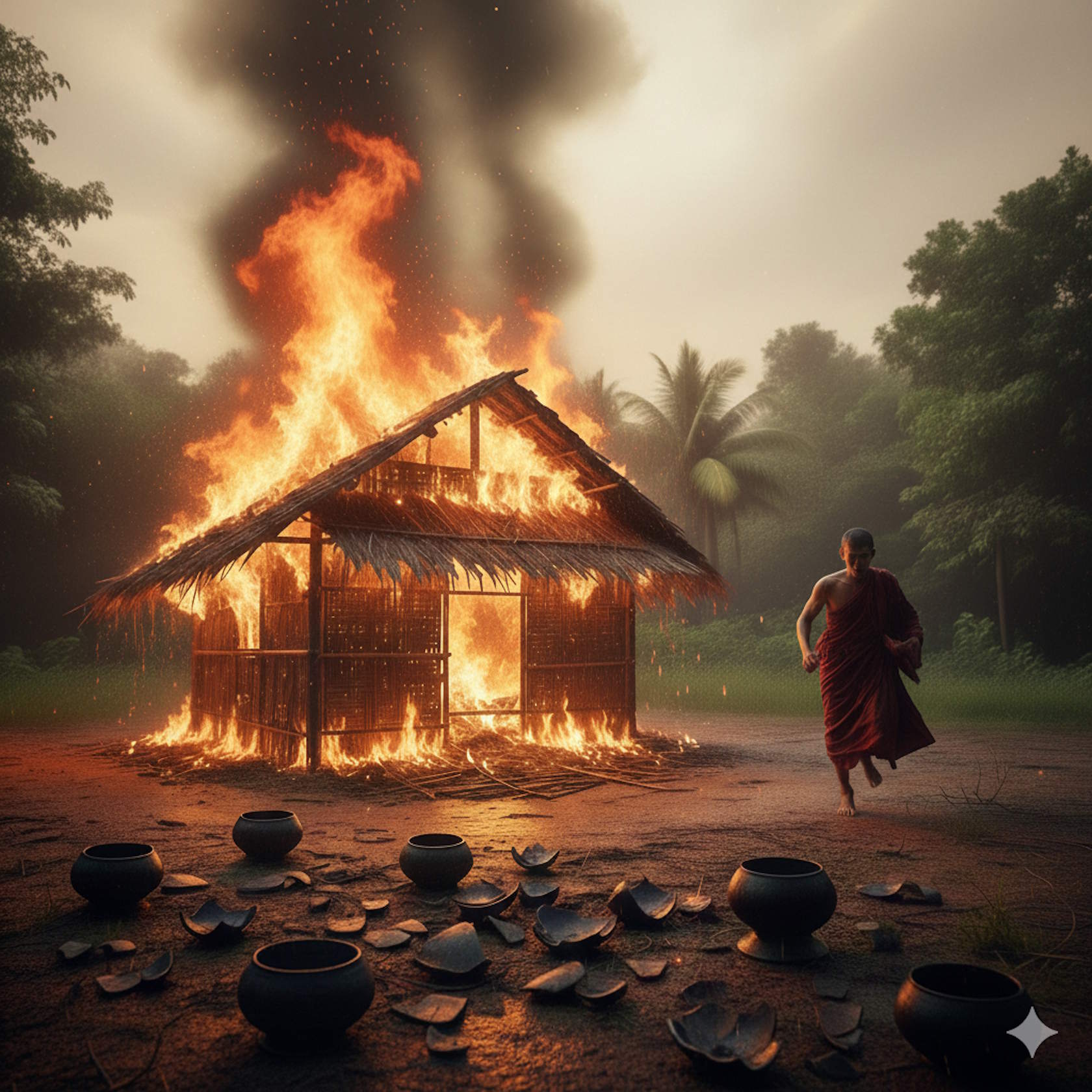 — Да, Достопочтенный, архат доволен. Вот только один юный послушник, разгневавшись из-за сделанного ему наставления, поджёг его хижину из листьев и сбежал.