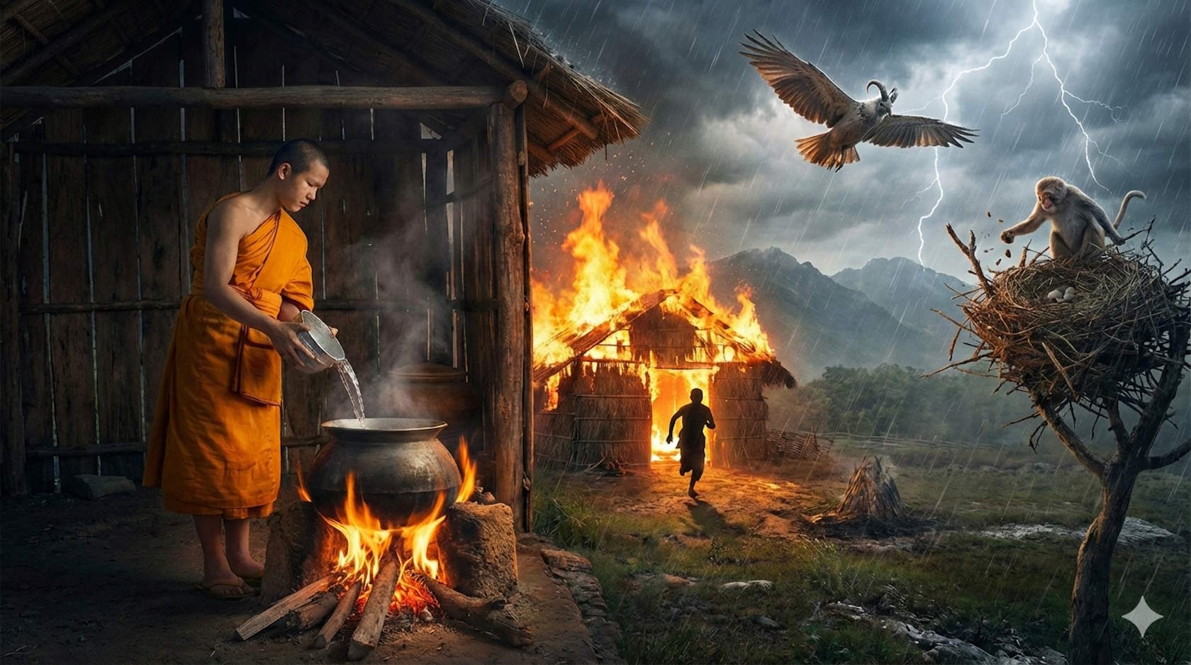 Обезьяна подумала: «Эта птица живёт в защищённом от дождя месте, а меня презирает. Я не дам ей спокойно отдыхать в своём гнезде». В гневе обезьяна прыгнула на Бодхисаттву, желая схватить его, но он взлетел в воздух и улетел прочь. Обезьяна тоже удалилась, но только после того, как разломала и разрушила гнездо Бодхисаттвы.