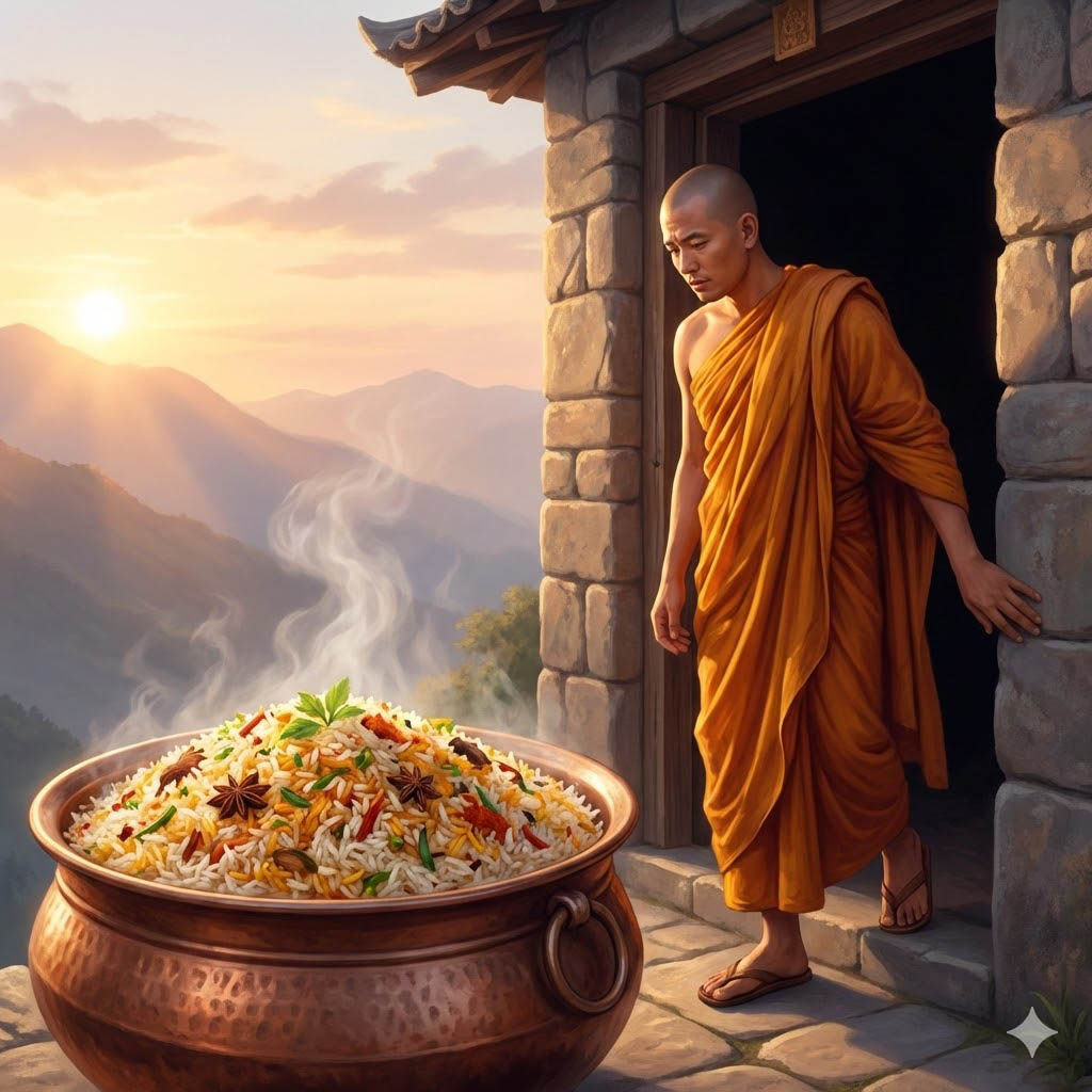 В то время в Раджагрихе жили два друга, один из них стал бхикшу (монахом) у Будды, другой — у Девадатты. Они продолжали видеться друг с другом, либо случайно, либо навещали друг друга в своих монастырях. Однажды приверженец Девадатты сказал другому [бхикшу]: «Друг, почему ты каждый день ходишь в поте лица за подаянием? Девадатта спокойно сидит в своей обители на горе Гайяширша и питается изысканными яствами, приправленными самыми наилучшими приправами. Это единственный верный путь. Зачем создавать себе неудобства? Почему бы тебе не прийти первым делом утром в монастырь [на горе] Гайяширша и не отведать там нашей рисовой каши, попробовать наши восемнадцать видов яств и насладиться нашей превосходной мягкой пищей со всеми наилучшими приправами?». Того бхикшу уговаривали снова и снова, и ему захотелось отправиться туда. С этого момента он стал ходить [на гору] Гайяширша и принимать трапезу там, не забывая, однако, возвращаться в бамбуковую рощу в положенный час.
