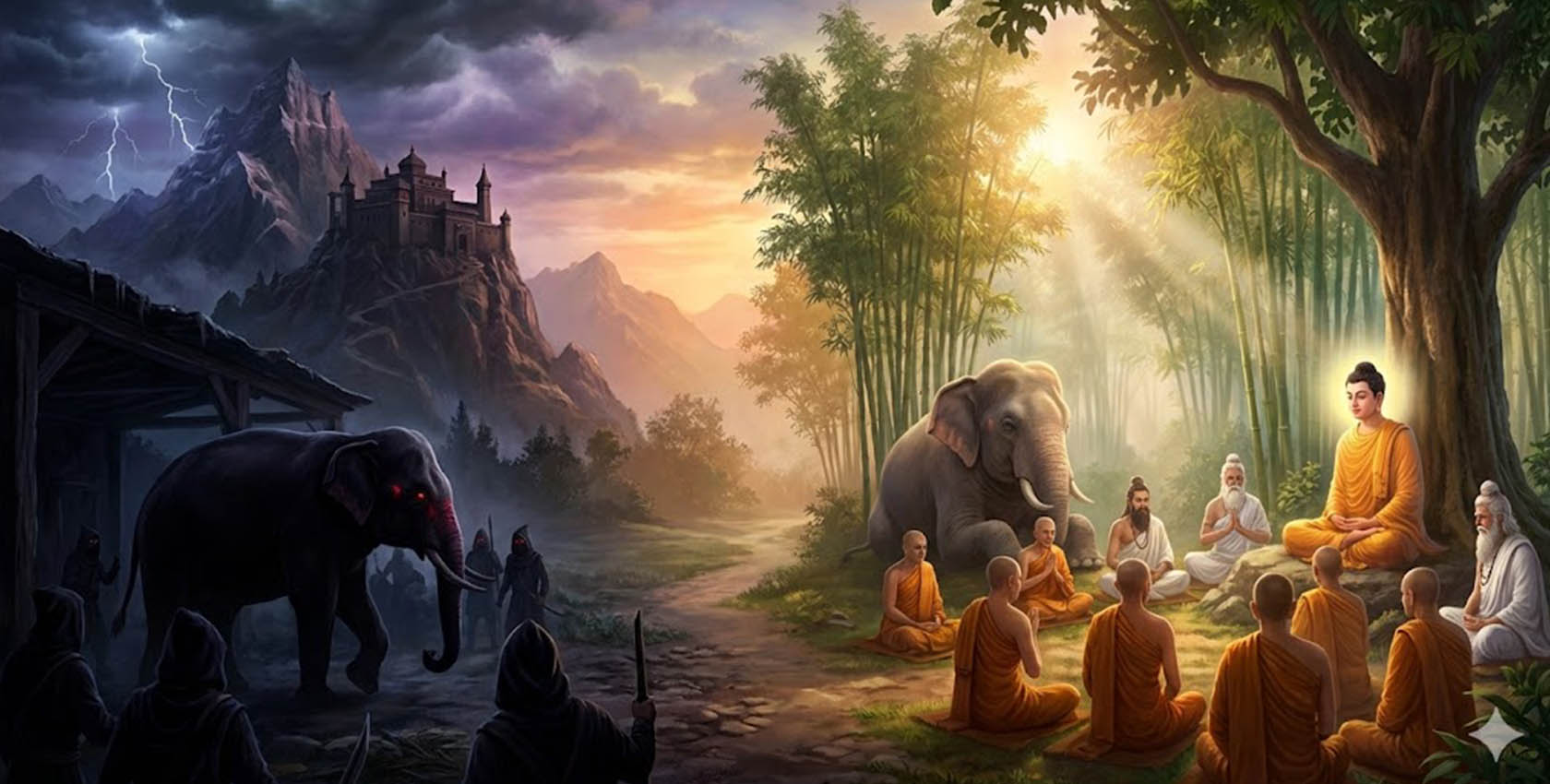 Царь спросил Бодхисаттву: «Скажи, дорогой, как он, усмирился?». Бодхисаттва ответил: «Да, Владыка, слон, который был таким злым, вернул себе прежние добродетели благодаря пандитам». Сказав это, он произнёс гатху: