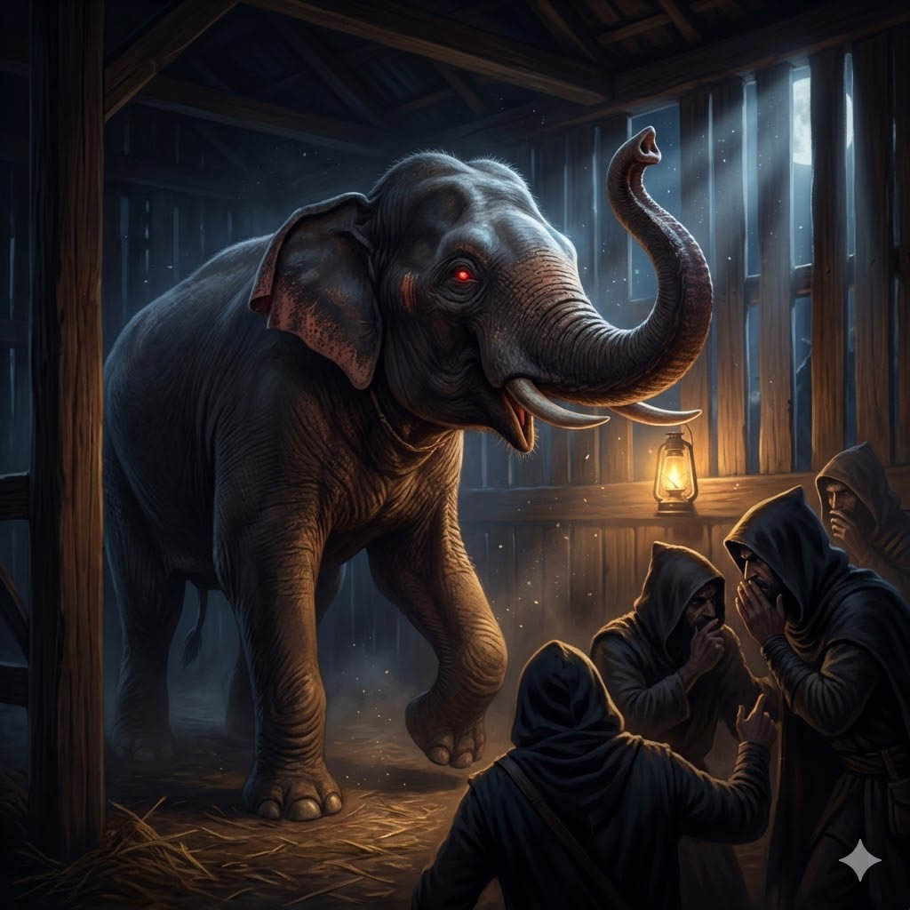 Однажды, когда в Варанаси правил Брахмадатта, Бодхисаттва был его советником. В то время у царя был личный слон, по имени Махиламукха; он был хорошо воспитан, добродетелен и никому не причинял вреда. Как-то ночью к стойлу слона подошли несколько разбойников и, присев рядом, завели такой разговор: «Так следует выкопать туннель, так — проломить стены; туннель и пролом в стенах должны быть хорошо проходимыми, как дорога или брод, тогда следует приступать к ограблению. Кто понесёт награбленное, должен и убивать, чтобы никто не смог оказать сопротивление. Разбойник не должен руководствоваться добродетелью или нравственностью, а должен быть жестоким, свирепым и безжалостным». Напутствовав друг друга такими советами, разбойники ушли. Несколько дней они так приходили снова и обсуждали свои планы. Услышав их слова, слон подумал: «Они хотят обучить именно меня, теперь я должен быть жестоким, свирепым и безжалостным» — и стал таким. Не успел его смотритель появиться ранним утром, как слон схватил его хоботом, бросил на землю и убил. И так же он поступил с каждым, кто приближался к нему.
