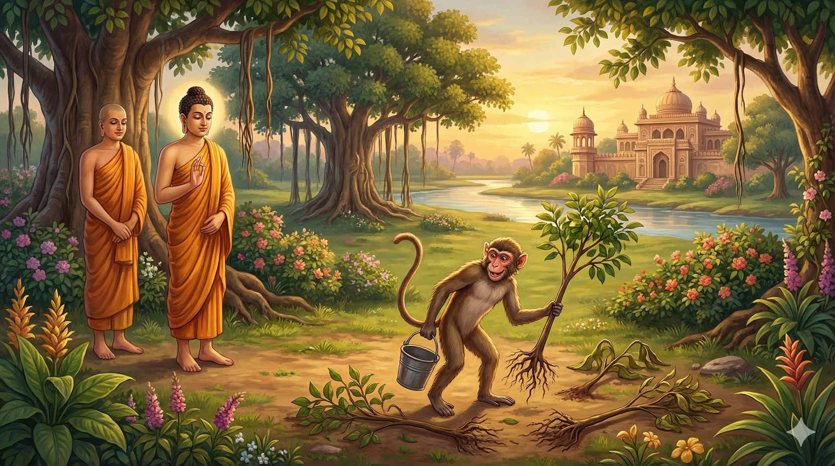 Обезьяны взяли кожаные шланги и деревянные сосуды с водой и принялись поливать молодые деревья [водой]. Тогда старейшина обезьян сказал им: