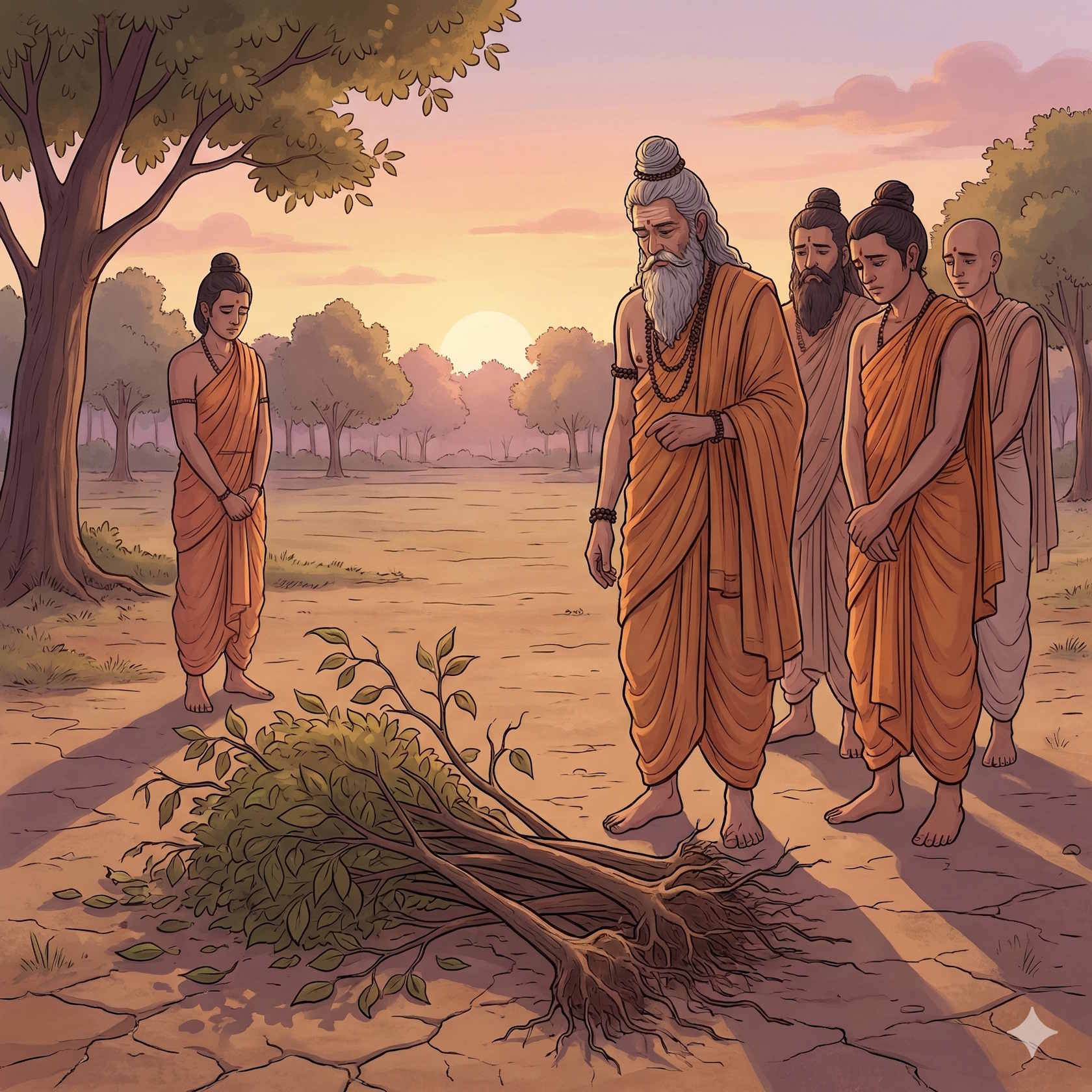 — Дорогой старейшина обезьян, этот парк приносит тебе большую пользу, поскольку ты питаешься здесь цветами, фруктами и молодыми побегами. В городе, однако, провозгласили накшатру, и я хочу отпраздновать её. Не могли бы вы, пока я не вернусь, полить молодые деревья в этом парке?