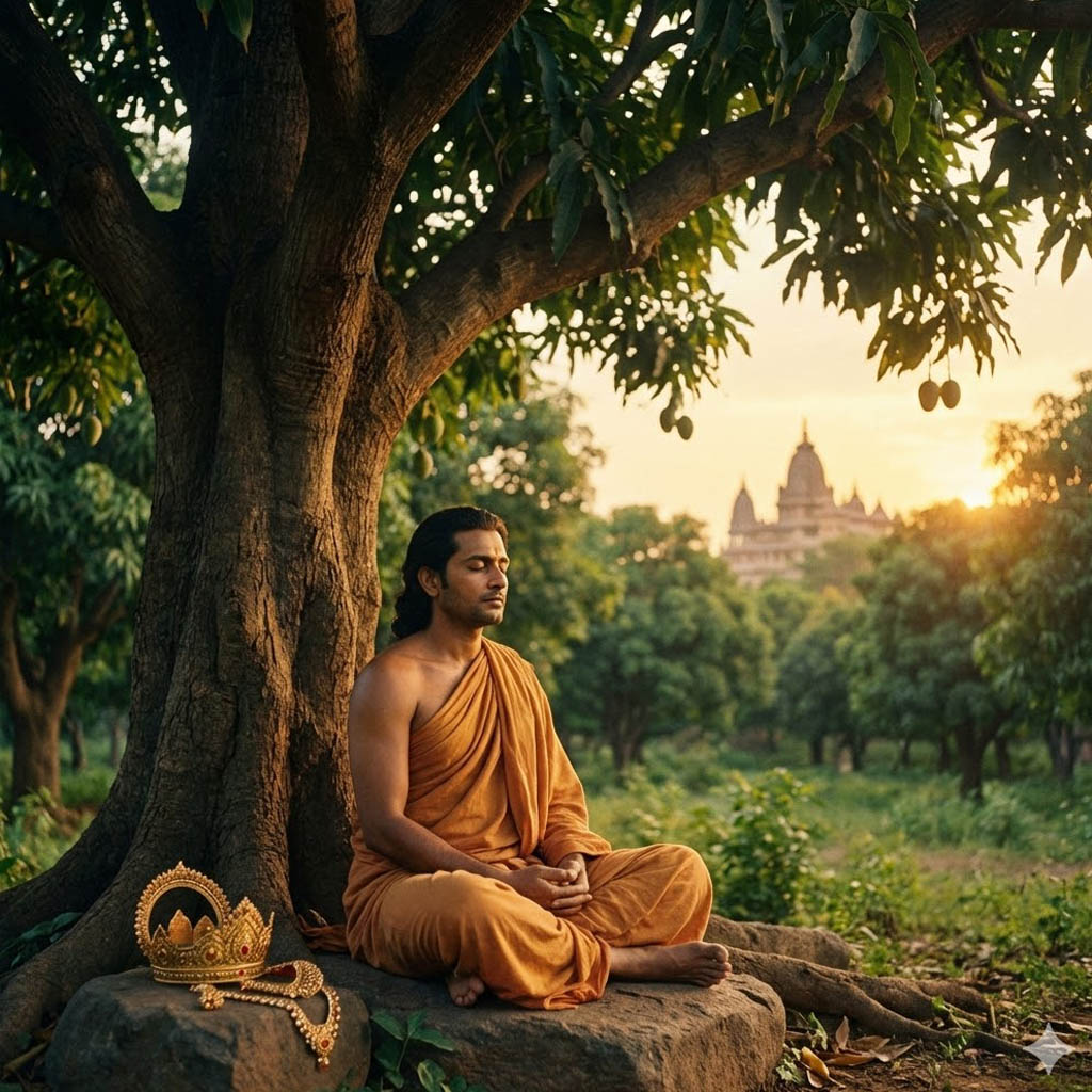 "Нынче же покину мир суеты и начну жизнь скитальца-монаха", - решил царь. Он подарил брадобрею огромное поместье стоимостью в сотню тысяч золотых монет, а затем, обращаясь к старшему сыну, сказал: "Голова моя поседела, и сам я вижу, что стар. Досыта вкусил я утех земных, видно, пришло время для утех небесных: настала пора оставить суетный мир. Воссядь же на престол, а я, покинув дворец, удалюсь под сень манговой рощи и, живя там, буду следовать дхамме отшельника".
