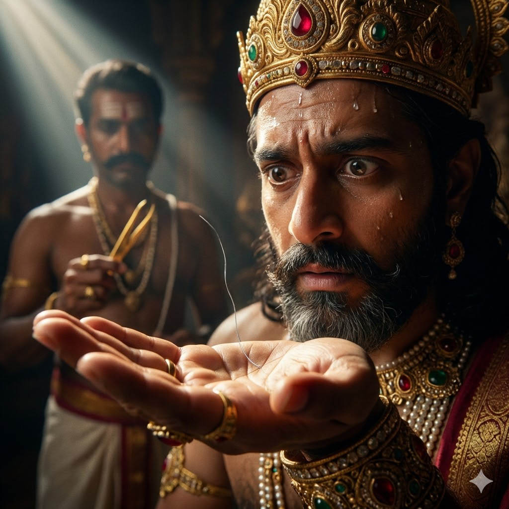 Прошло ещё много лет, и вот однажды, увидав в чёрных как смоль волосах царя один-единственный седой волосок, брадобрей почтительно молвил: "О государь, у тебя появился седой волосок". "Вырви его, любезный, и положи мне на ладонь!" - приказал царь. Повинуясь ему, брадобрей золотыми щипчиками вырвал седой волос и положил владыке на ладонь. Хотя знал царь, что до конца срока, отпущенного ему в этом рождении, оставалось ещё восемьдесят четыре тысячи лет, едва только глянул он на седой волос, как сердце его наполнилось унынием и тоской. Почудилось ему, будто бы он заперт в хижине, охваченной пламенем, перед ним стоит сам царь Смерти и говорит ему: "Неразумный Макхадева! Вот уж и седина в твоих волосах, а ты так и не сумел разомкнуть объятия терзающих тебя страстей". И, чем дольше размышлял царь о своей седине, тем сильнее жгла его тоска, тем обильнее проступал пот на челе его, тем сильнее ощущал он тяжесть своего царского облачения.