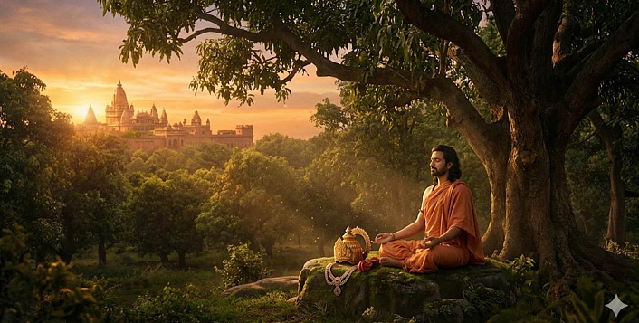 И в тот же день царь отрёкся от престола и сделался отшельником, чуждым всего мирского. Прожив остальные восемьдесят четыре тысячи лет в святой обители в манговой роще, он утвердился на пути сосредоточенного размышления и одолел четыре ступени восхождения. По завершении же земного срока он возродился в мире Брахмы, а затем - снова низвергся на землю, в ту же самую Митхилу, в облике царя по имени Ними. Возвысив свой хиреющий род, царь Ними в конце концов отринул мир, удалился в святую обитель в той же манговой роще и, взойдя по ступеням совершенств, вновь оказался в мире Брахмы".