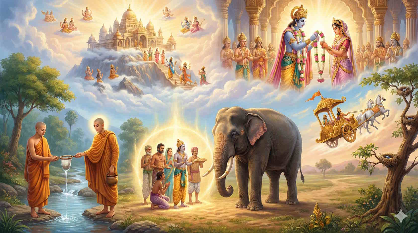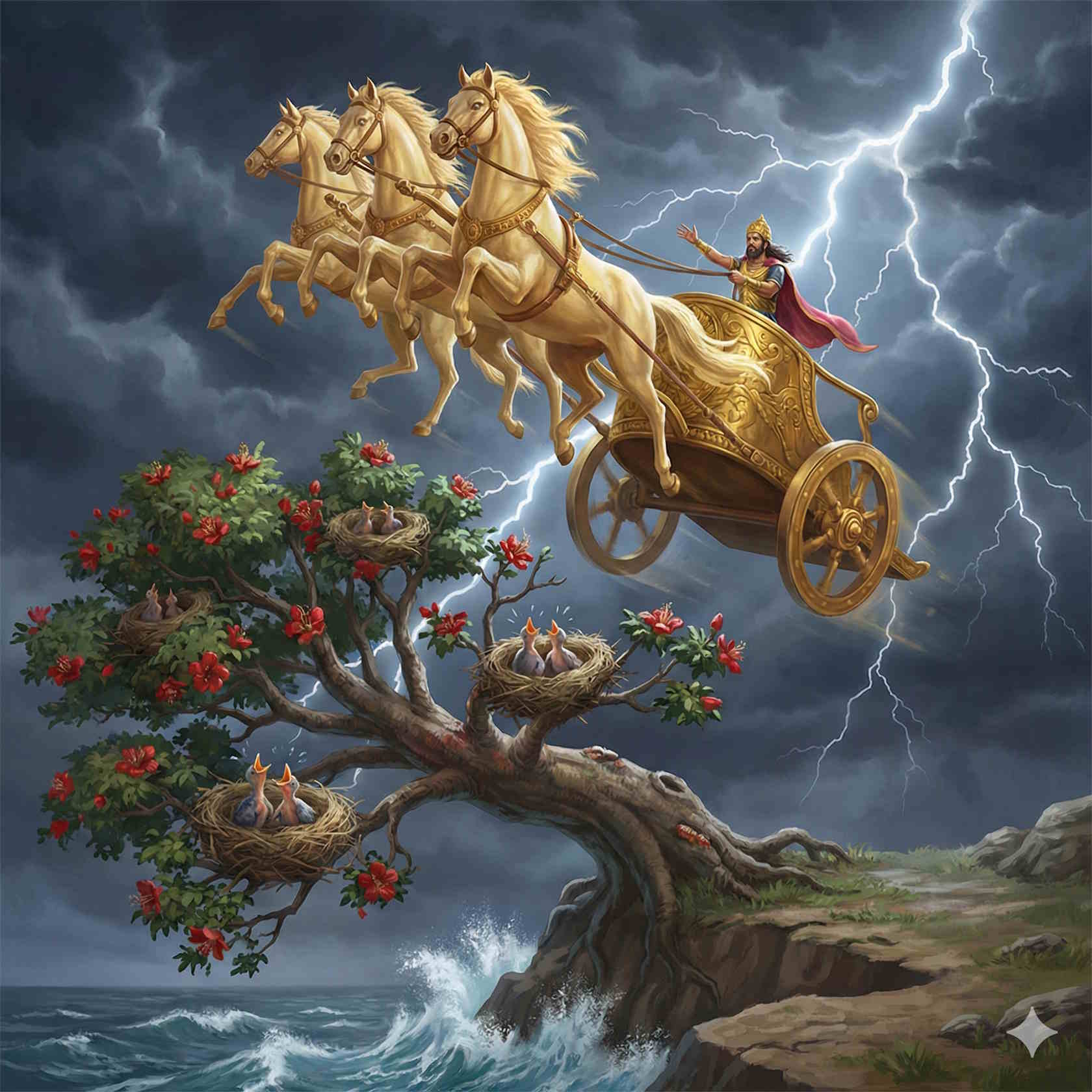 И вот, когда колесница Сакки с невиданной быстротой неслась над просторами Океана, она приблизилась к месту, где раскинулась шёлковичная роща, и деревья, оказавшиеся на пути колесницы, срезаемые под корень, будто простые пальмы, валились и падали прямо в пучину Океана. А в гнёздах, свитых на ветвях шёлковичных деревьев, сидели птенцы пернатых Гаруд и, низвергаясь в пучину Океана, громко плакали и кричали. И спросил тогда Сакка у своего колесничего Матали: "Послушай, Матали, что это за шум? Что за плач, наполняющий сердце великой печалью?" И ответил ему на это Матали: "Государь, твоя колесница мчится с такой быстротой, что на пути своём низвергает в пучину Океана деревья шёлковичной рощи со свитыми на их ветвях гнёздами Гаруд, и птенцы Пернатых, охваченные страхом смерти, громко кричат и плачут". И повелел тогда Великосущный: "Друг Матали! Да прекратится страдание, причиняемое им мною! Да не свершим мы, домогаясь власти, злого дела, не допустим умерщвления живых существ! Уж лучше пожертвуем собственной жизнью и предадимся асурам во имя спасения этих птенцов! Поворачивай колесницу!" И, повелев так, Сакка спел такую гатху: