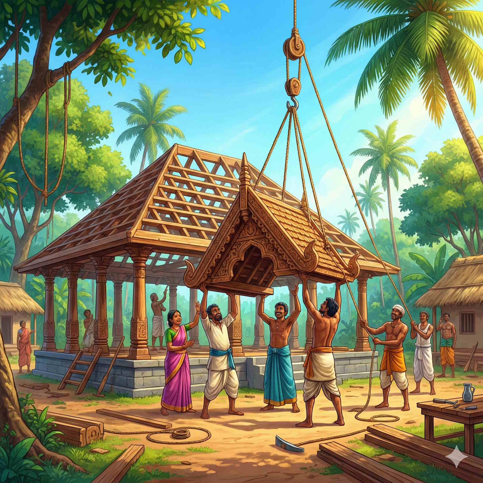 После этого жители деревни, наставленные бодхисаттой, продолжали творить всяческие добрые дела. И решили они на скрещении главных дорог выстроить большой дом для собраний и, призвав на помощь плотника, вскоре начали строить здание, но женщин к этому делу близко не подпускали, так как утратили к ним всякий интерес. А надобно сказать, что в ту пору у бодхисатты были четыре жены, жившие с ним же в деревне: благостная Судхамма, премудрая Читта, весёлая Нанда и благородная Суджата. И вот однажды, улучив миг, когда плотник остался один, Судхамма поднесла ему дары и стала молить: "Братец, сделай меня старшей над всеми в доме собраний", - и плотник обещал ей. Прервав на время работу, он притащил бревно, из которого вырубают конёк для крыши, хорошенько его высушил, обтесал, обработал, изготовил конёк, завернул в кусок ткани и спрятал до поры. Когда дом собраний был выстроен и настало время увенчать крышу коньком, плотник воскликнул, будто досадуя: "Вот беда, забыли мы про одну вещь!" "О чём ты?" - спросили его. "Надо приделать конёк на крышу", - отвечал плотник. "За чем дело стало? Давай сейчас и соорудим", - сказали крестьяне. "Нет, - отвечал плотник, - из сырого дерева конёк не соорудишь, надо было загодя срубить дерево, обтесать его, а после сделать конёк". "Как же теперь быть?" - спросили плотника жители. Плотник ответил: "Надо посмотреть, нет ли у кого в доме готового конька на продажу; если есть - можно взять".