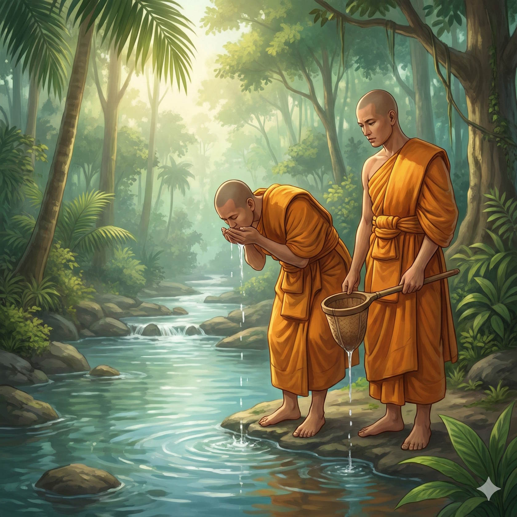 Ибо, как рассказывают, двое молодых монахов-друзей отправились из Саваттхи в паломничество по стране. Остановились в одном красивом доме, пожили там, сколько хотели, а затем надумали пойти повидаться с Всепробуждённым и направились к Джетаване. У одного из монахов была цедилка, у другого не было и, когда им хотелось пить, они пили по очереди, пользуясь одной цедилкой. Но вот однажды друзья поссорились, и тот, кому принадлежала цедилка, не стал больше давать её своему другу. Сам напился отцеженной воды, а друг, у которого не было цедилки, мучаясь от жажды, напился прямо из источника.