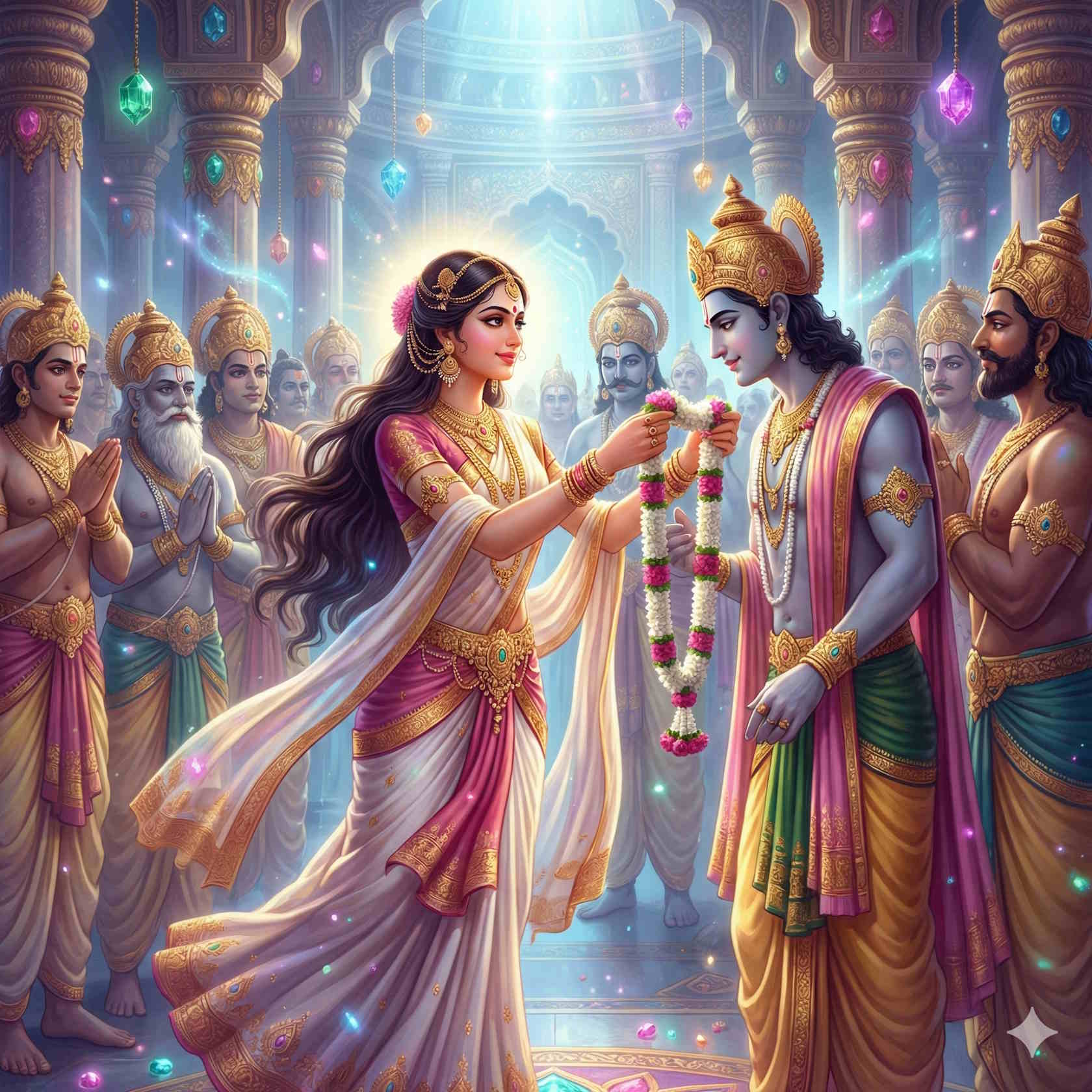 Суджата до конца дней своих твёрдо следовала пяти установлениям и в новой жизни возродилась дочерью повелителя асуров Вепачнтти, а за нравственную стойкость в прежних рождениях была ей дарована великая красота. Когда пришла пора выдавать её замуж, царь Вепачитти распорядился: "Пусть моя дочь сама найдёт себе мужа по сердцу", - и он велел всем асурам собраться для брачного состязания. Сакка же как раз тогда помыслил: "Где-то ныне возродилась Суджата?" - и силой всеведения тотчас её обнаружил. "Уж если Суджате суждено самой выбрать себе мужа, пусть выберет меня", - решил он и, оборотясь асуром, явился в собрание. Ввели разряженную Суджату, усадили её на почётное место и сказали: "Кто тебе по сердцу, того и выбирай в мужья!" Суджата вгляделась в собравшихся, приметила Сакку и, повинуясь силе любовного чувства, укрепившегося в ней ещё в прежних рождениях, воскликнула: "Вот кого я хочу в мужья!" Взяв Суджату в жёны, Сакка перенёс её в небесную столицу и поставил старшей над двадцатью пятью коти небесных танцовщиц. И жил так Сакка до конца положенного ему срока, а по истечении срока перешёл в иное рождение в согласии с накопленными заслугами".