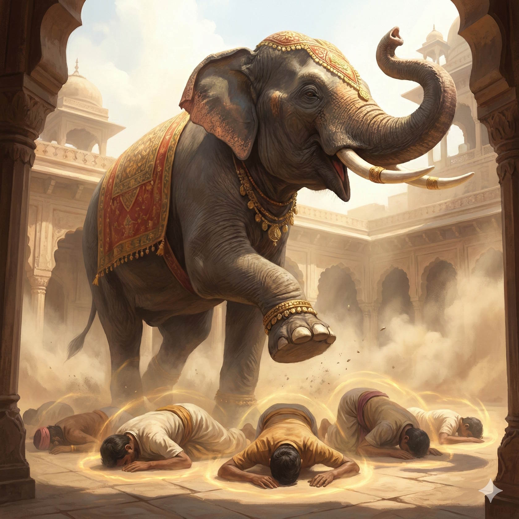 И вот приказали всем лечь ничком на царском дворе и послали людей за слоном. Бодхисатта же так сказал своим спутникам: "Не забывайте пяти установлений и относитесь с одинаковой любовью и к доносчику, и к царю, и к слону, и к собственному телу", - и те обещали сделать всё так, как велит бодхисатта. Наконец привели слона, но тот, как его ни принуждали, не стал никого топтать, а помчался прочь, громко трубя. Привели ещё слона, и ещё, и ещё, но все убегали прочь. Повелел тогда царь обыскать крестьян, нет ли у них при себе снадобья, отваживающего слонов, но те, кто искал, ничего не нашли и о том доложили царю. И наказал тогда царь своим слугам: "Допросите-ка их хорошенько. Не иначе как ведомо им какое-то заклинание". И когда царские слуги стали выпытывать у крестьян, нет ли у них какого-нибудь заклинания, отвращающего слонов, бодхисатта ответил, что есть у них такое заклинание. Прислужники доложили про то царю, и царь, повелев всех доставить к нему, приказал: "Говорите! Какое вам ведомо заклинание?"