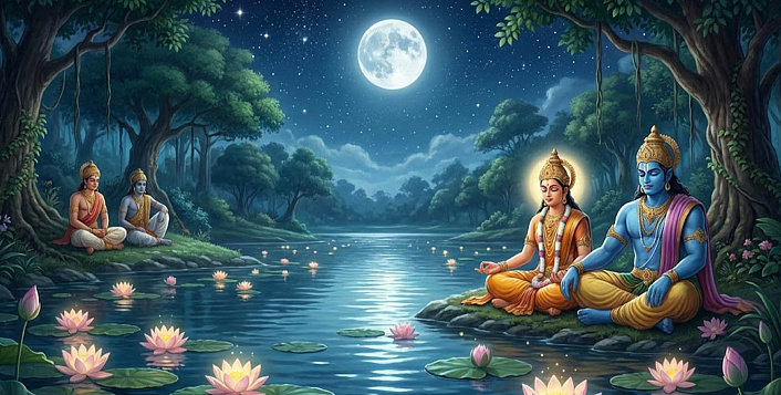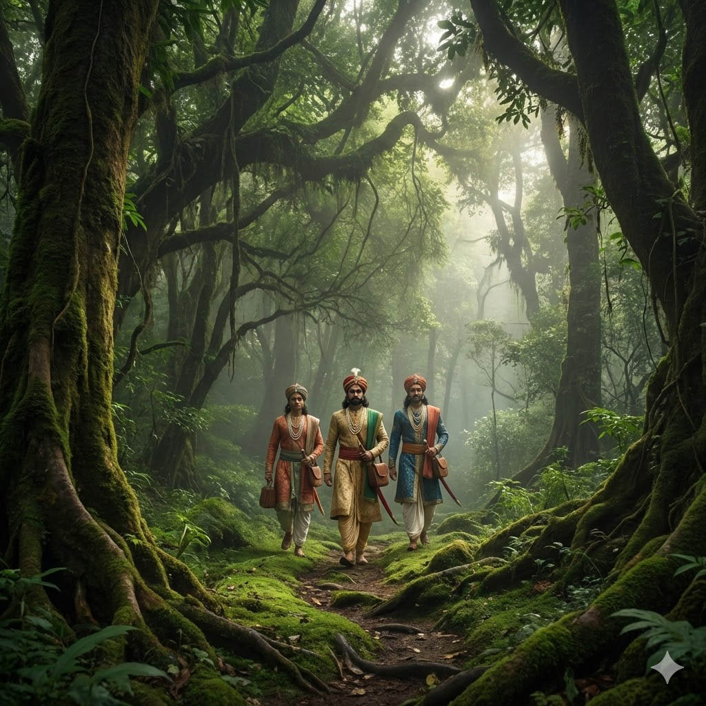 Немного погодя царица повторила свою просьбу. Видя её упорство, царь стал опасаться, как бы она не замыслила дурного против его детей. Он призвал к себе сыновей и сказал им: "Дорогие мои! В день, когда родился царевич Сурья, я обещал его матери исполнить любое её желание. И вот она требует царство для своего сына. Я ей отказал, но, как известно, весь женский род исполнен зла, и она может замыслить против вас дурное. Ступайте, поживите в лесу. После моей кончины вы возвратитесь в город, искони принадлежащий нашему роду, и воссядете на царство". С горькими слезами царь облобызал сыновей, и они ушли.