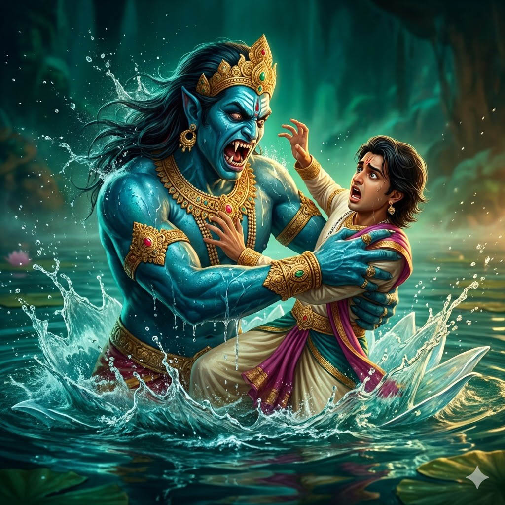 С тех пор каждого, кто вступал в подвластные ему воды, ракшас спрашивал: постигли ли они высшую дхамму, и пожирал всех, кто обнаруживал своё невежество. Едва Сурья вступил в озеро, ракшас тотчас же схватил его и спросил: "Ведомо ли тебе высочайшее?" "Чанда и Сурья - Луна и Солнце - вот высочайшее", - ответил царевич. "Нет, не ведомо тебе высочайшее!" - вскричал ракшас и утащил его в своё подводное жилище.