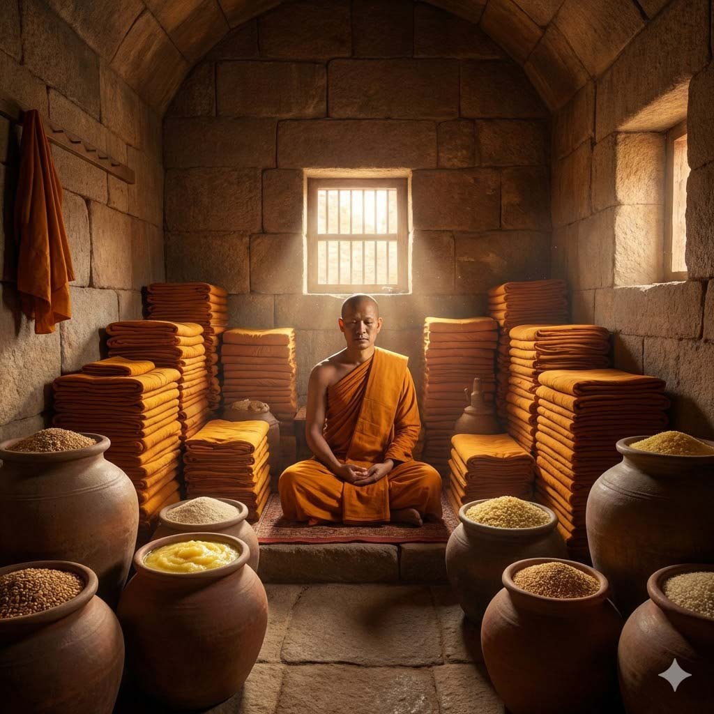 Некий саваттхийский мирянин, овдовев, решил стать монахом. Вступая на стезю монашества, бхиккху этот велел приготовить для себя отдельную келью и ещё одну потеплее, а также кладовую, распорядился наполнить эту кладовую топлёным маслом, рисом и прочими припасами и только после этого принял монашеский сан. Но и став бхиккху, сохранил он обыкновение посылать за слугами, дабы готовили они пищу для услаждения его чрева. И всё, чего у других монахов было мало, имелось у него в изобилии: спал он в одной одежде, днём надевал другую. И хоть был он простым бхиккху, жил он в некотором отдалении от всех. Однажды он разложил в своей келье для просушки одежды, покрывала и другие вещи. И зашла вдруг к нему толпа деревенских бхиккху, странствующих от обители к обители.